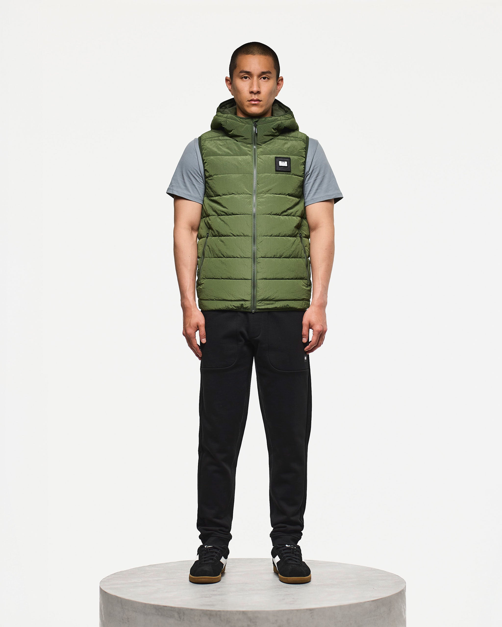 The Toronto Gilet is made from 100% Nylon two-tone ripstop custom woven with ultra fine black weft yarn and a highly saturated warp yarn for a rich depth of colour and resistance to tearing. Treated with an additional DWR (Durable Water Repellent) coating.