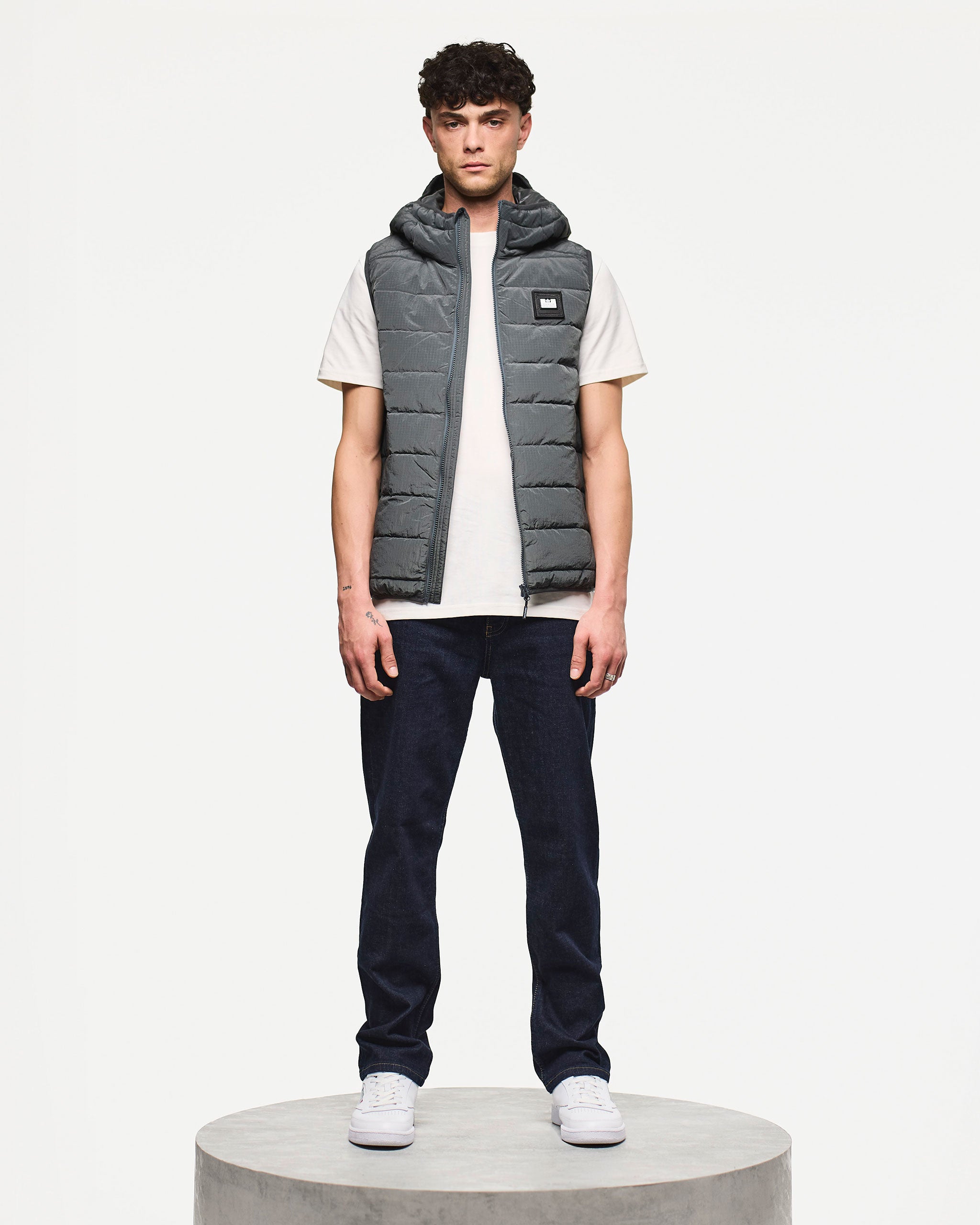 The Toronto Gilet is made from 100% Nylon two-tone ripstop custom woven with ultra fine black weft yarn and a highly saturated warp yarn for a rich depth of colour and resistance to tearing. Treated with an additional DWR (Durable Water Repellent) coating.