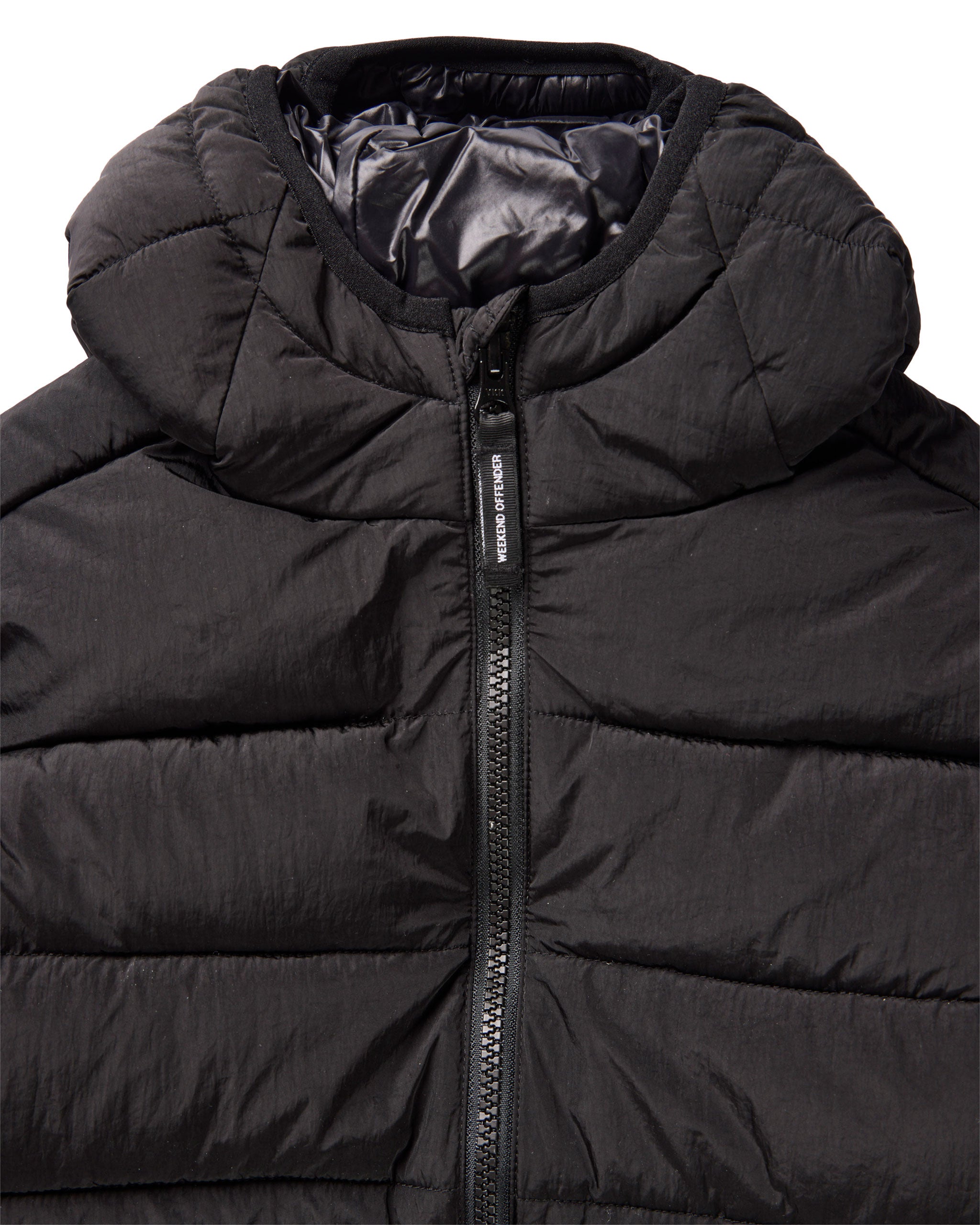 The La Guardia Puffer Jacket is made from a lightweight high density woven 100% Nylon parachute style fabric with misted lightly reflective surface.