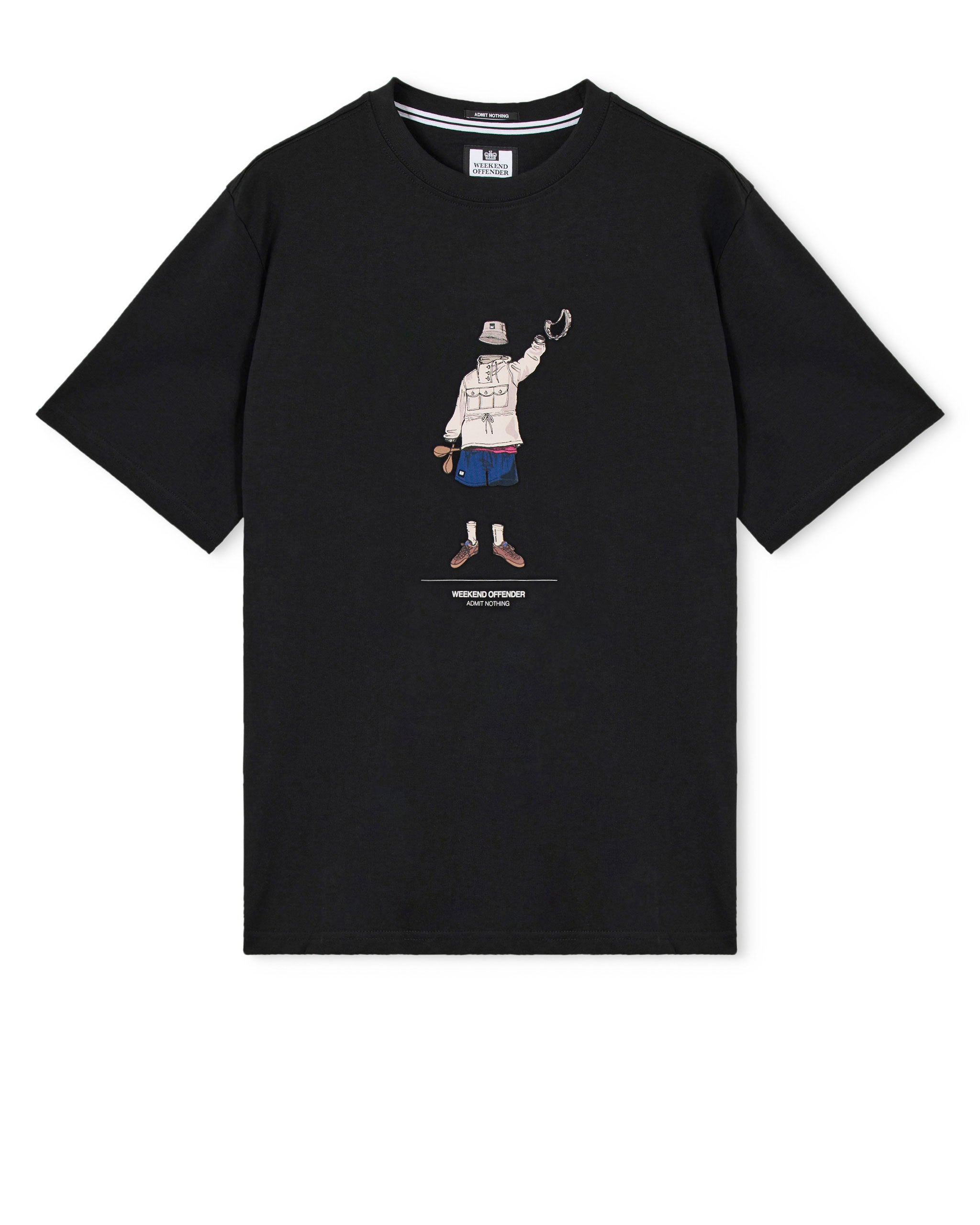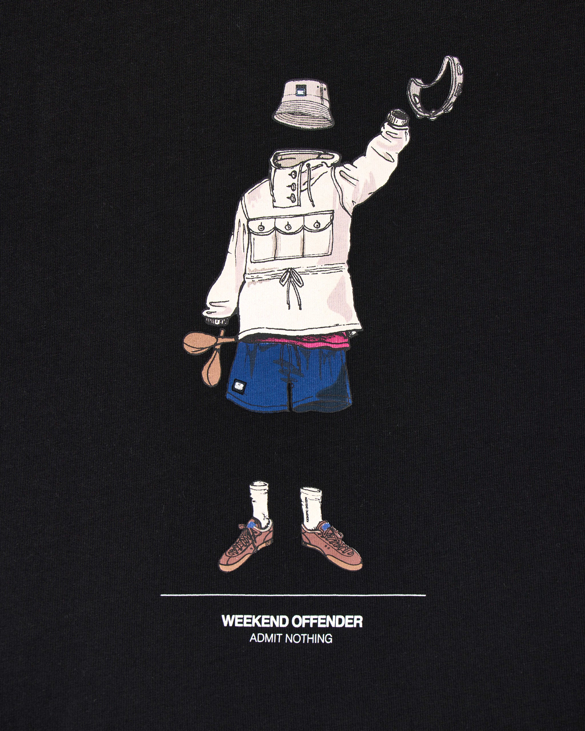 The Hassen graphic tee features a front print graphic of a headless figure in full Weekend Offender gear, with a floating bucket hat, tambourine in hand. A nod to music and terrace style.