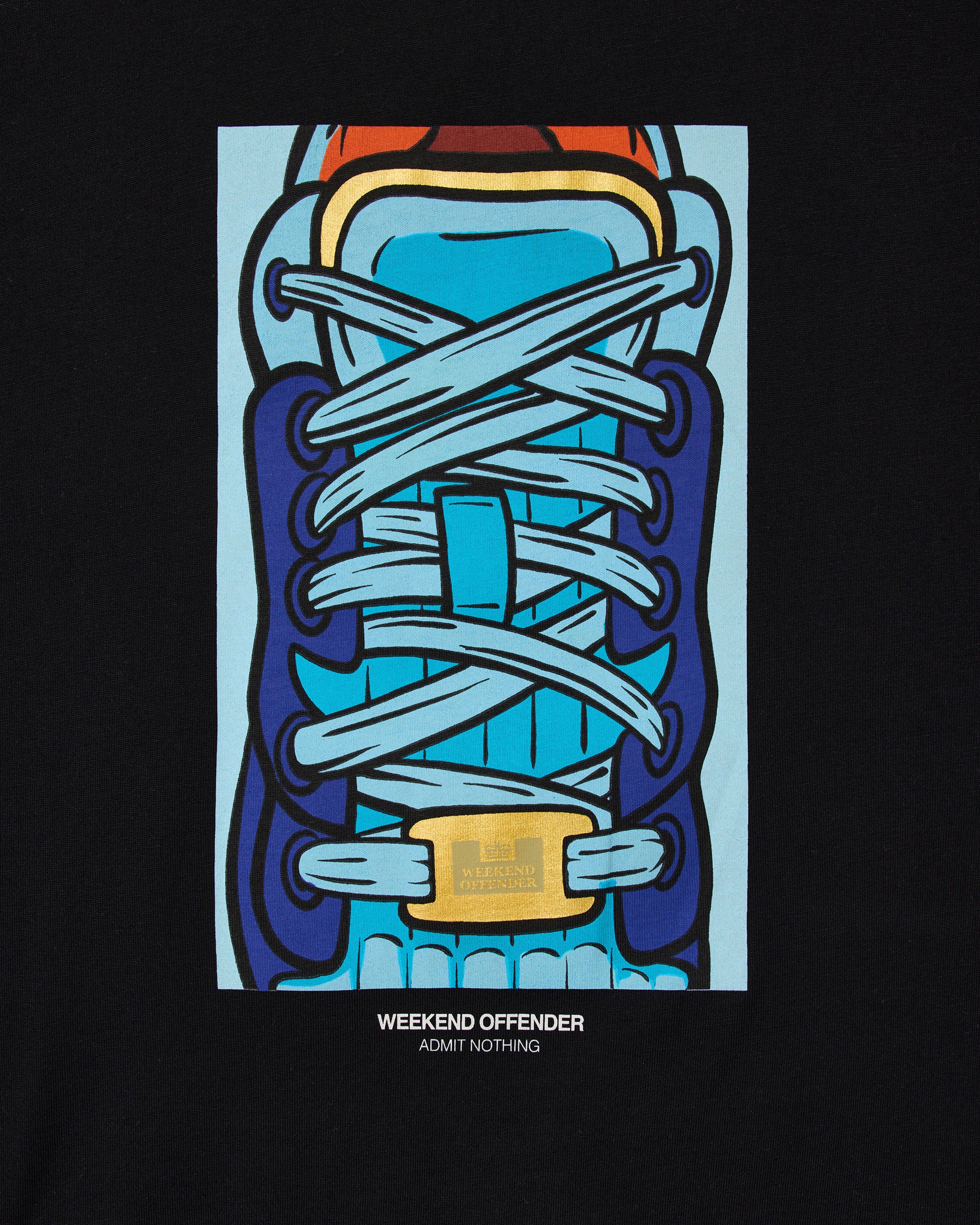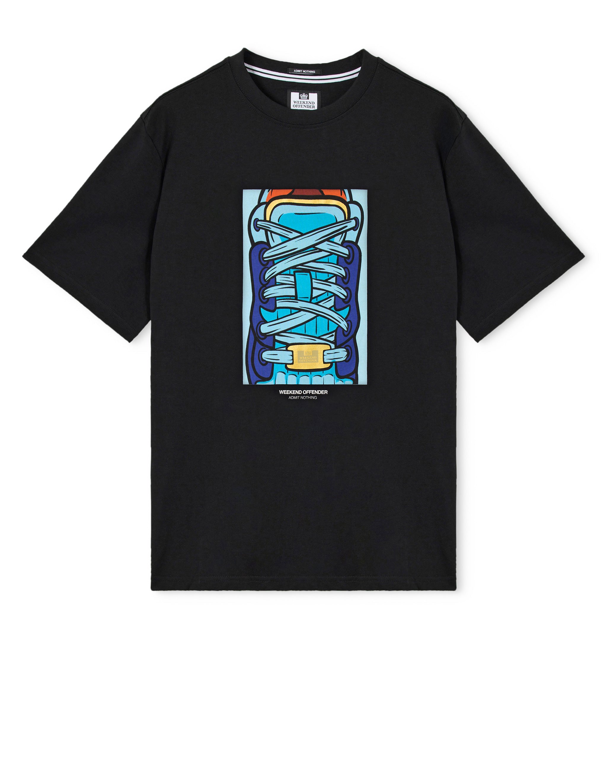 The Laces graphic tee features a stylised close-up of a laced trainer, reimagined in pop-art tones with a gold WEEKEND OFFENDER lace tag stamped front and centre.