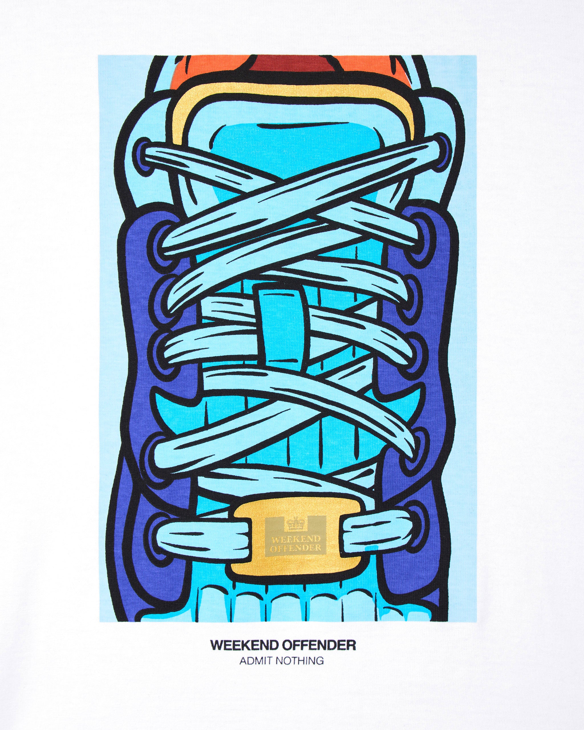 The Laces graphic tee features a stylised close-up of a laced trainer, reimagined in pop-art tones with a gold WEEKEND OFFENDER lace tag stamped front and centre.