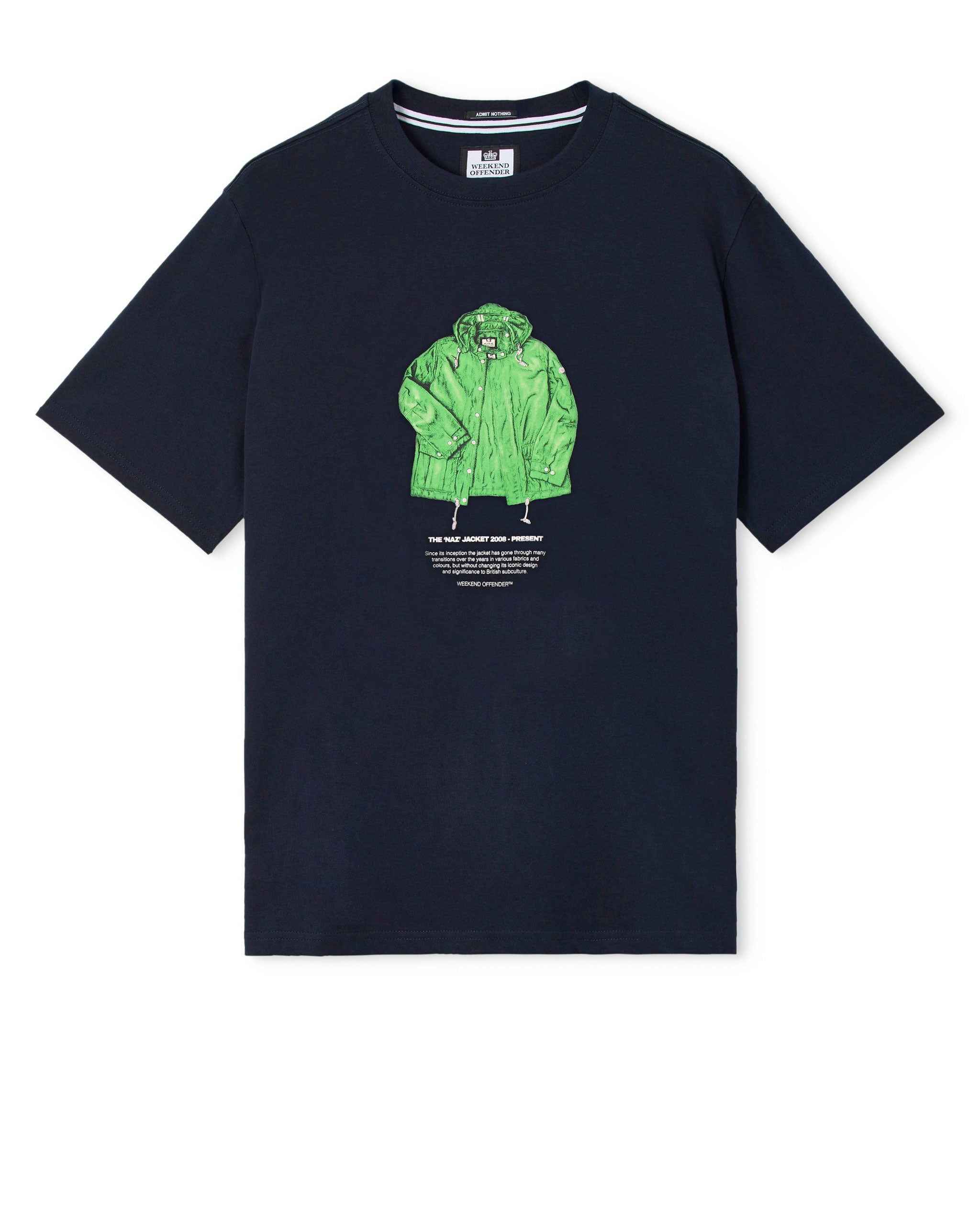 The Nav graphic tee features an illustrated tribute to the iconic Weekend Offender Naz jacket - a subcultural staple since 2008, worn by notable figures across music and street culture.