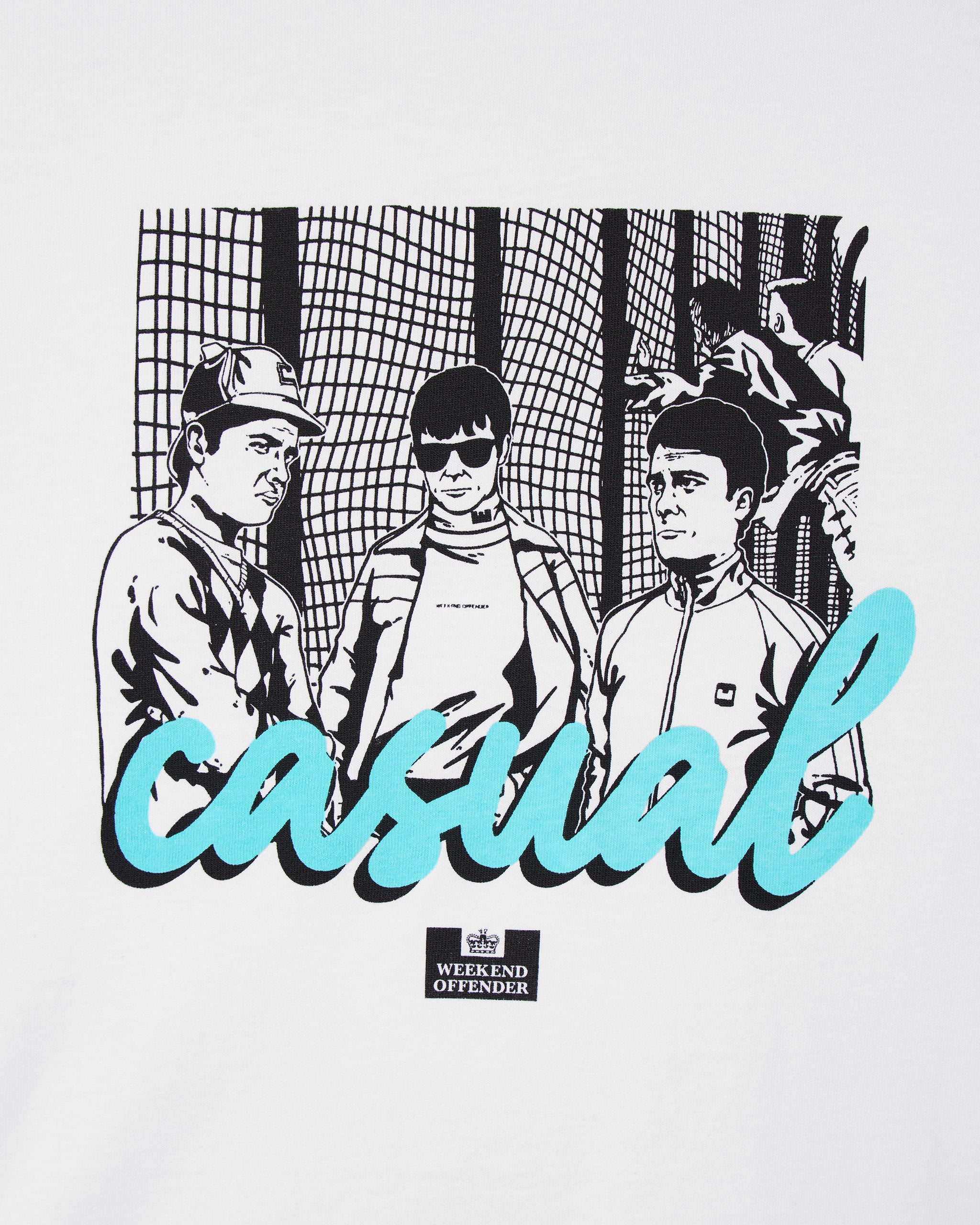 The Terrace graphic tee features an illustrated snapshot of 1980s British terrace culture. Agroup of fans in classic sportswear, set against the backdrop of a football ground.