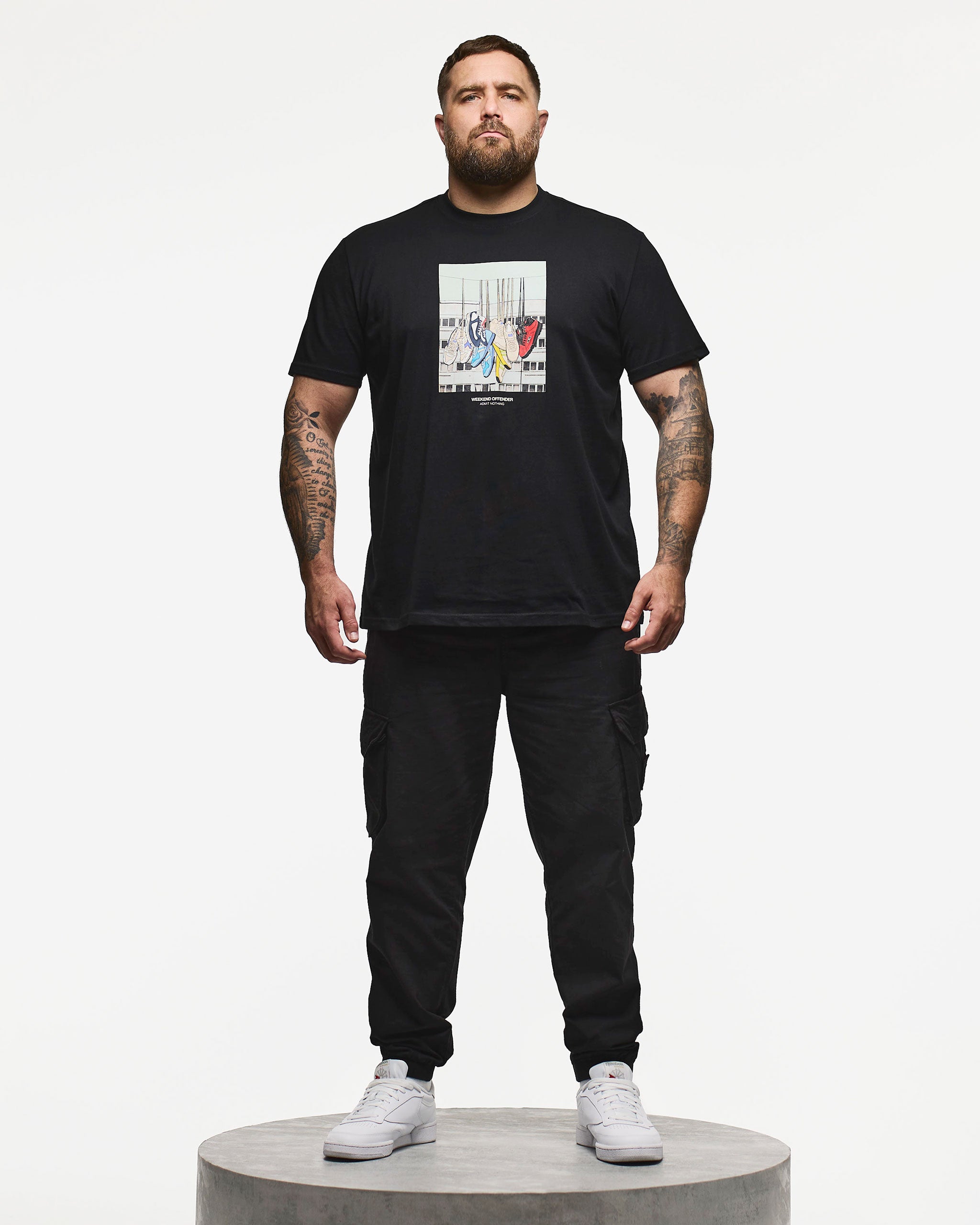 The Battle Lines Graphic Tee features a collection of iconic trainers dangling from telephone wires in set against the backdrop of a UK council estate.