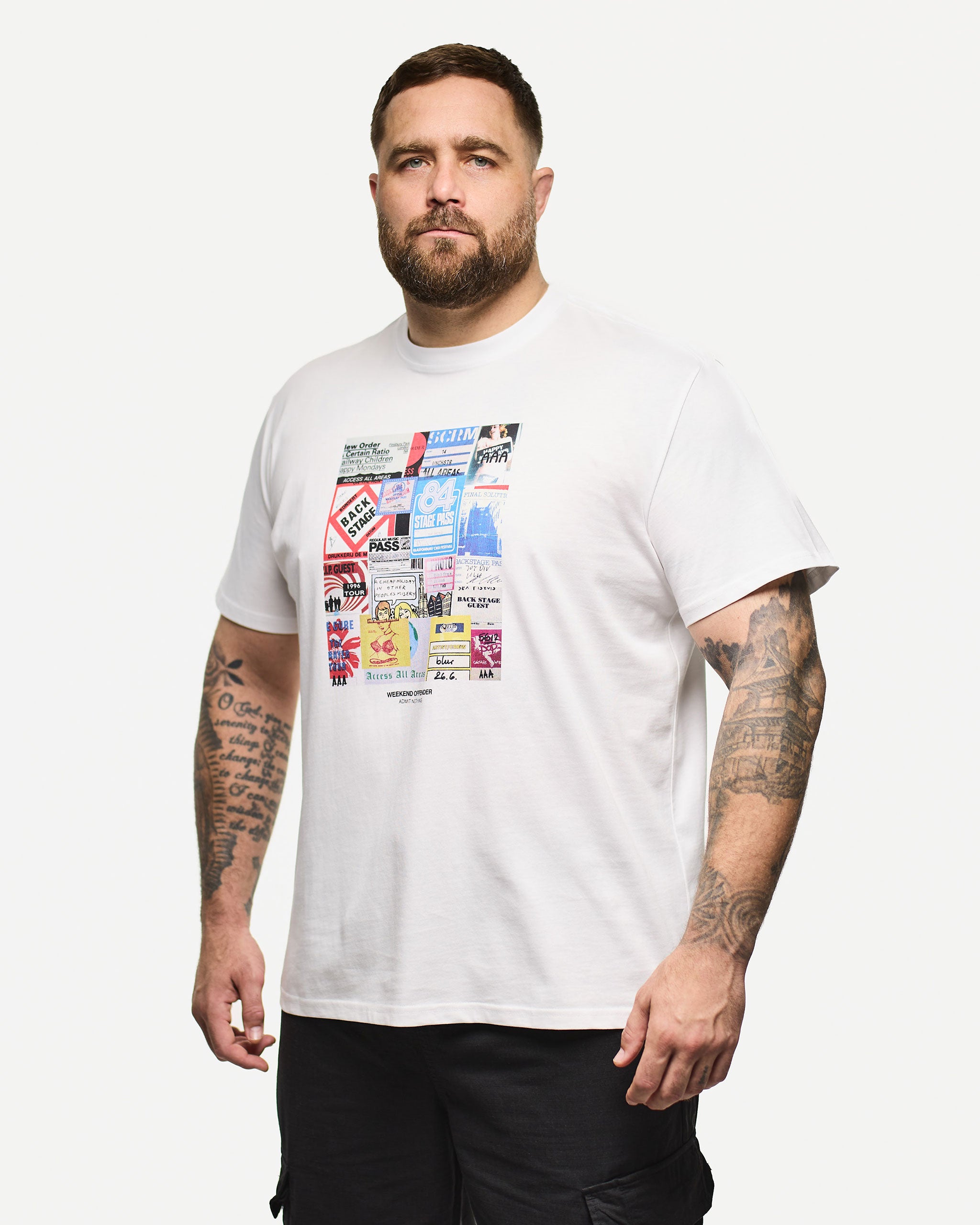 The Passes Graphic Tee displaying a photographic collage showcasing an eclectic collection of AAA passes from a diverse range of bands and artists across the music world. Each pass represents exclusive backstage access and is tied to iconic moments in music history.