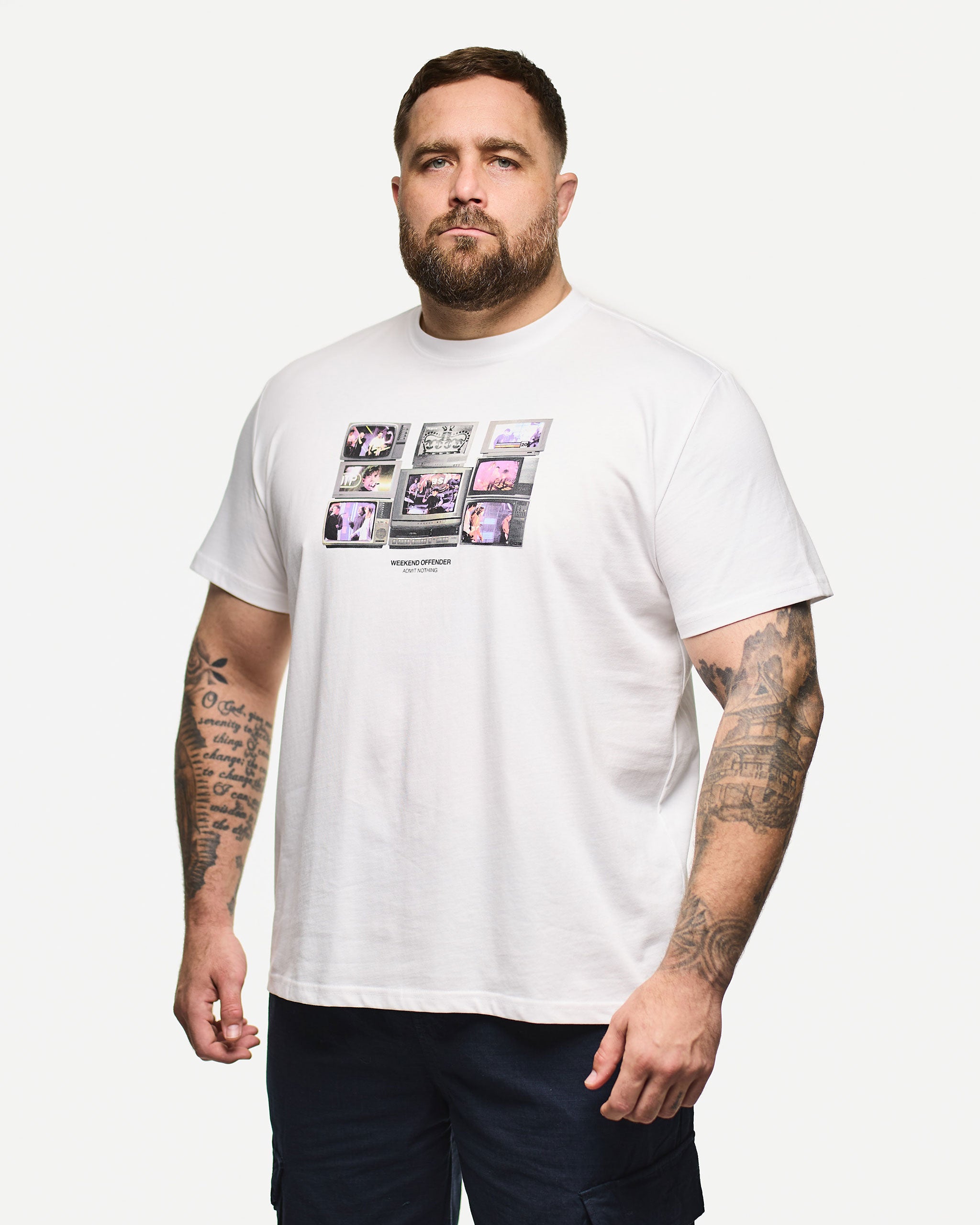 The Vision Graphic Tee displaying a surreal photographic print featuring a stack of retro TVs arranged to form the Weekend Offender prison logo. On the screens, iconic moments from some of our favourite bands are playing out.