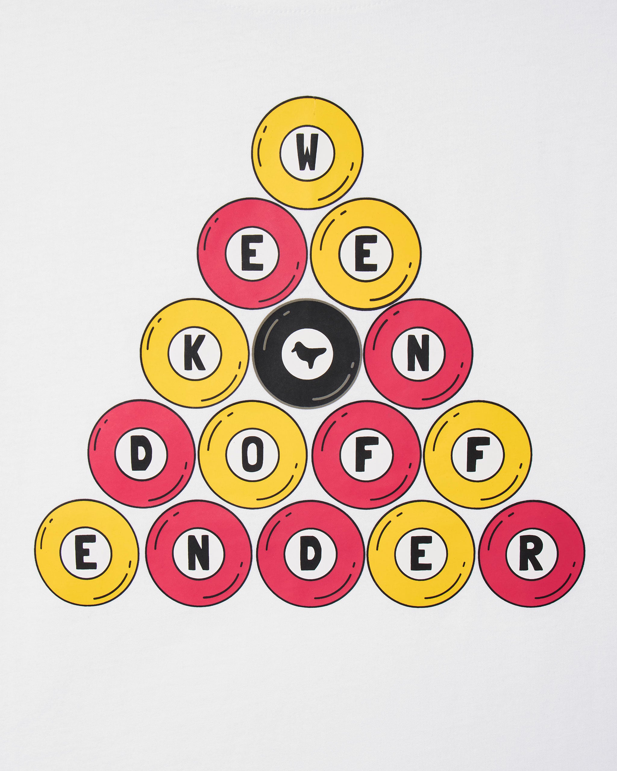 A nod to pub culture and casual heritage, this bold back print spells out WEEKEND OFFENDER in a triangle of pool balls, with the iconic 8-ball at the centre. A smaller version of the 8-ball sits printed on the chest for a clean front hit.