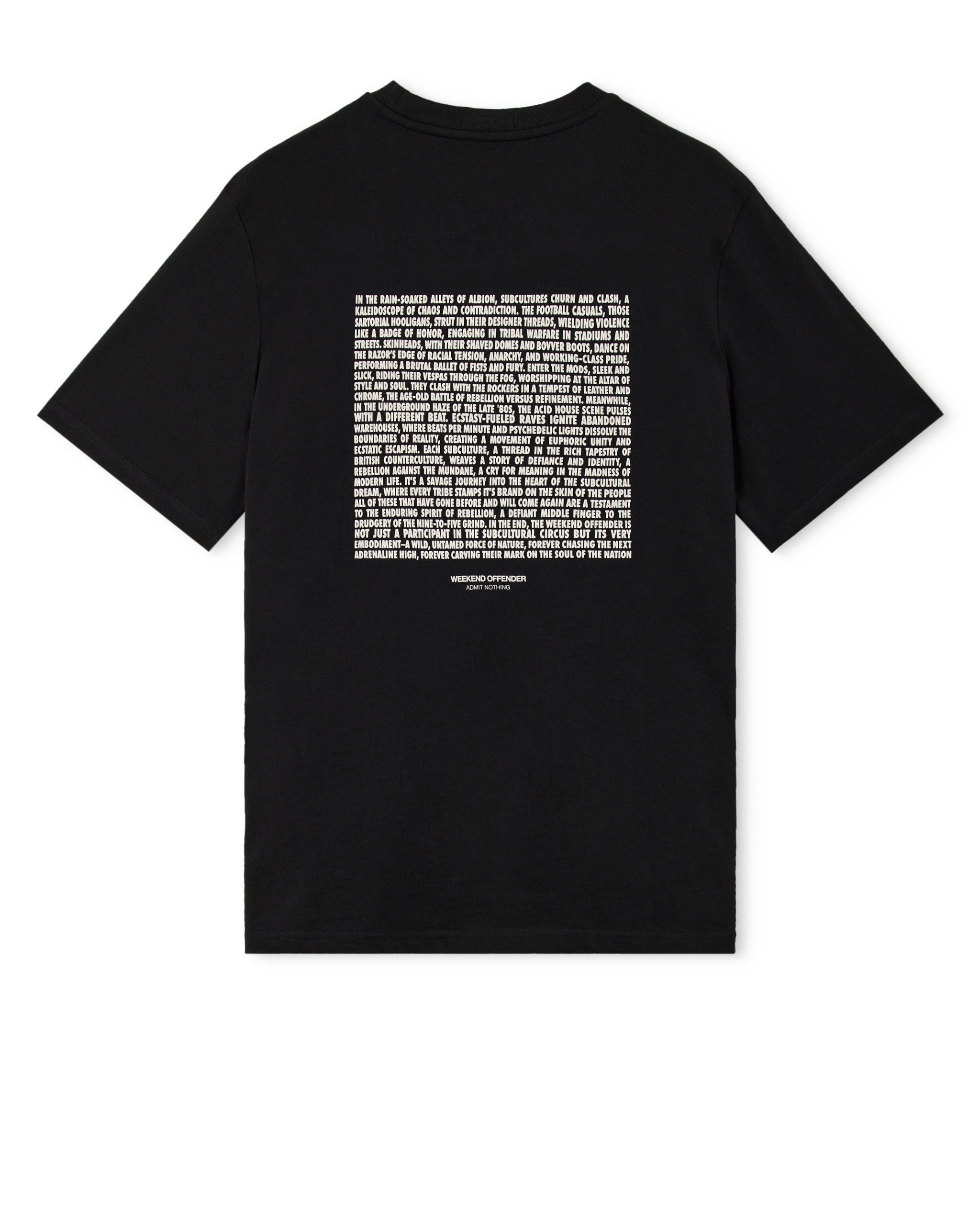 The Albion Graphic Tee features a collage of British subcultures — from terrace casuals to acid house ravers — merged to form the iconic Weekend Offender logo. Paired with a manifesto-style back print capturing the chaos, violence, music, and soul of youth culture through the decades.
