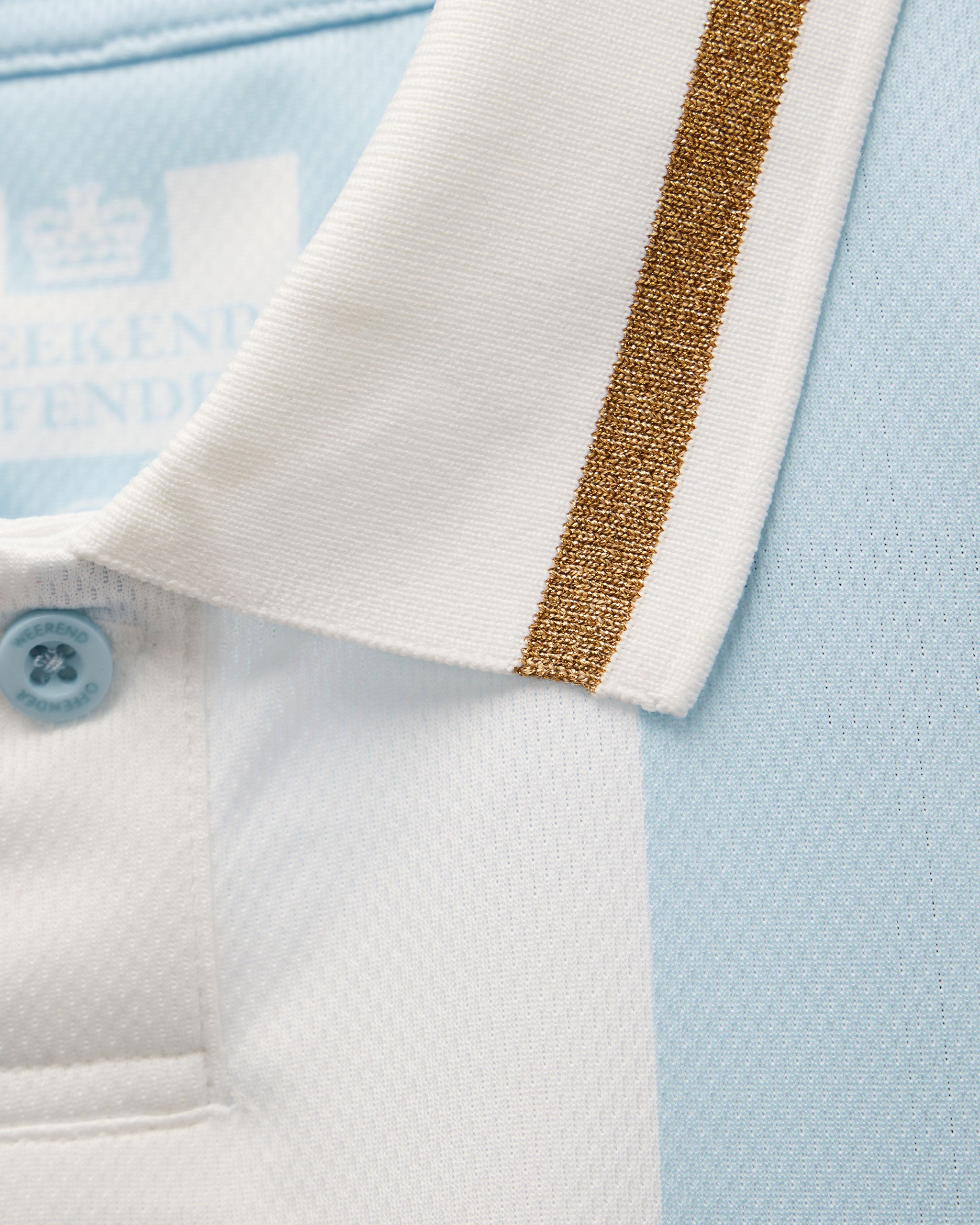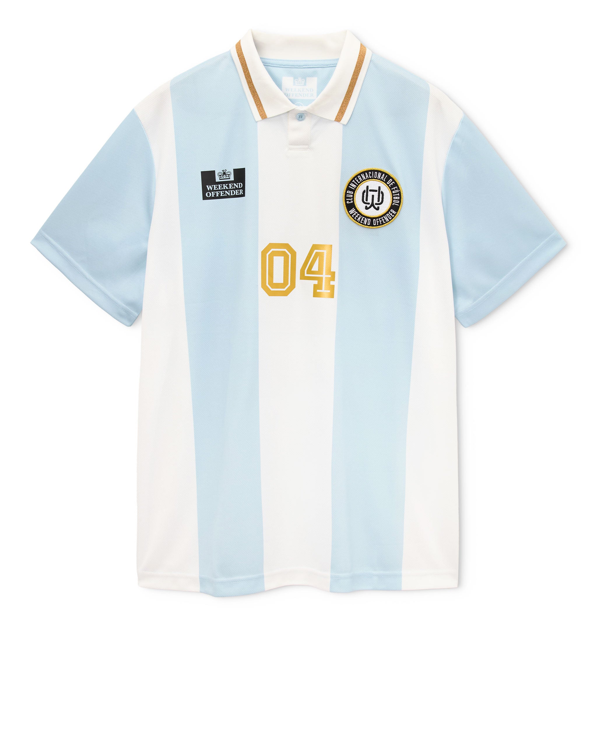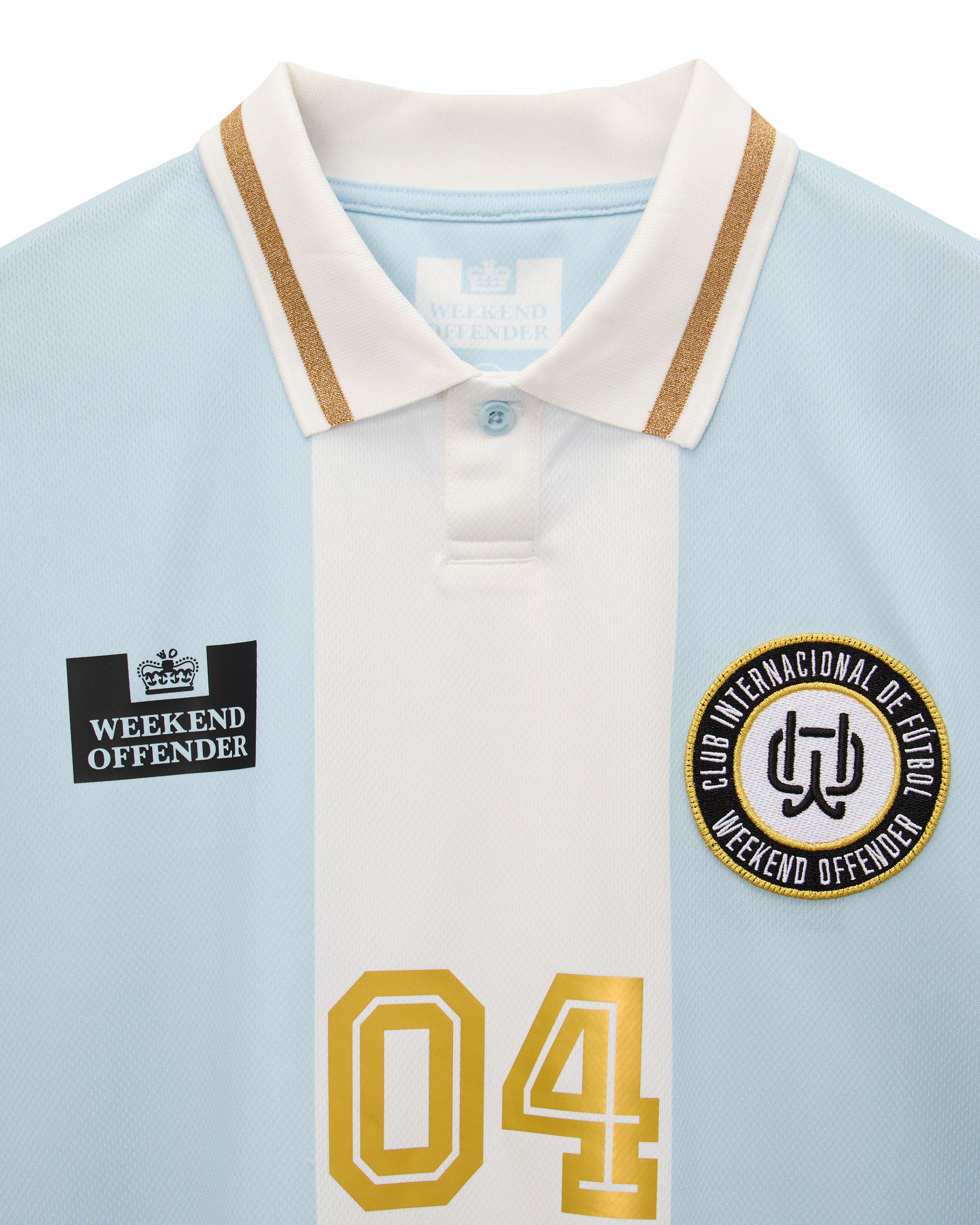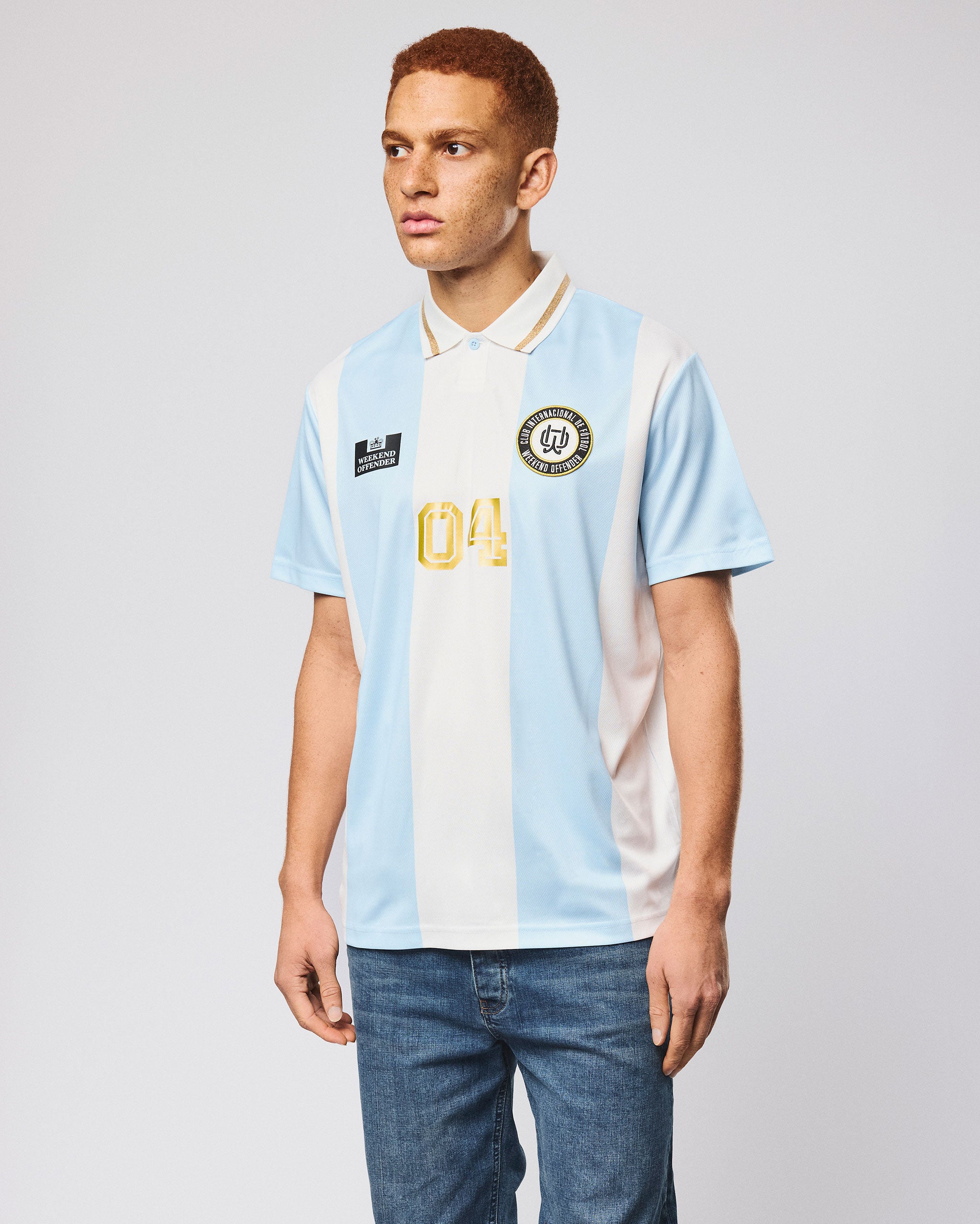 The Moulay Football Shirt features a classic nod to retro South American kits, this shirt features wide vertical stripes in sky blue and white. Finished with a contrast gold-trim collar, bold ‘04’ print and dual badges for a clean timeless look.