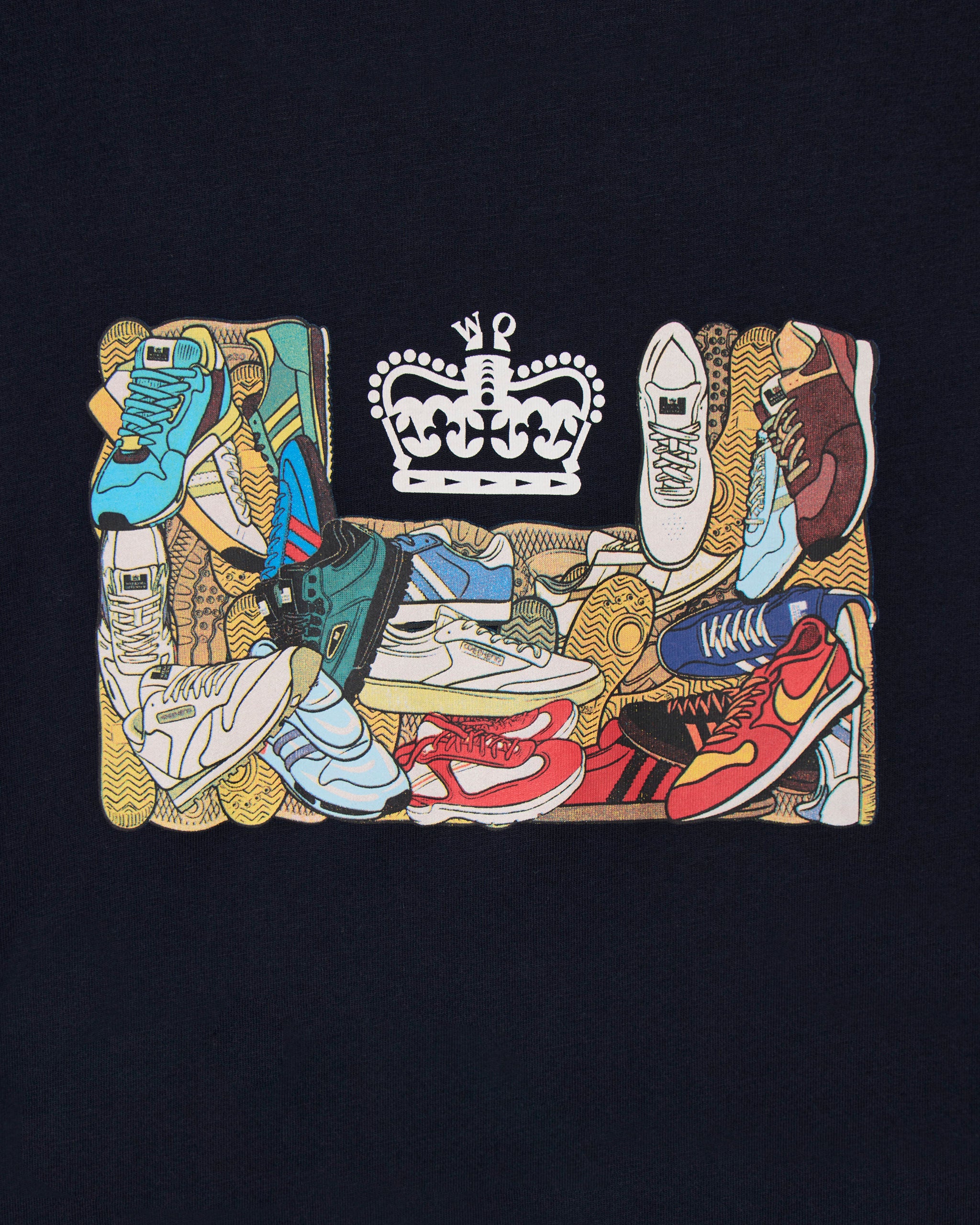 The D'Arblay Graphic Tee features a pile-up of classic terrace trainers forming the WEEKEND OFFENDER logo. A tribute to the soles that shaped a subculture.