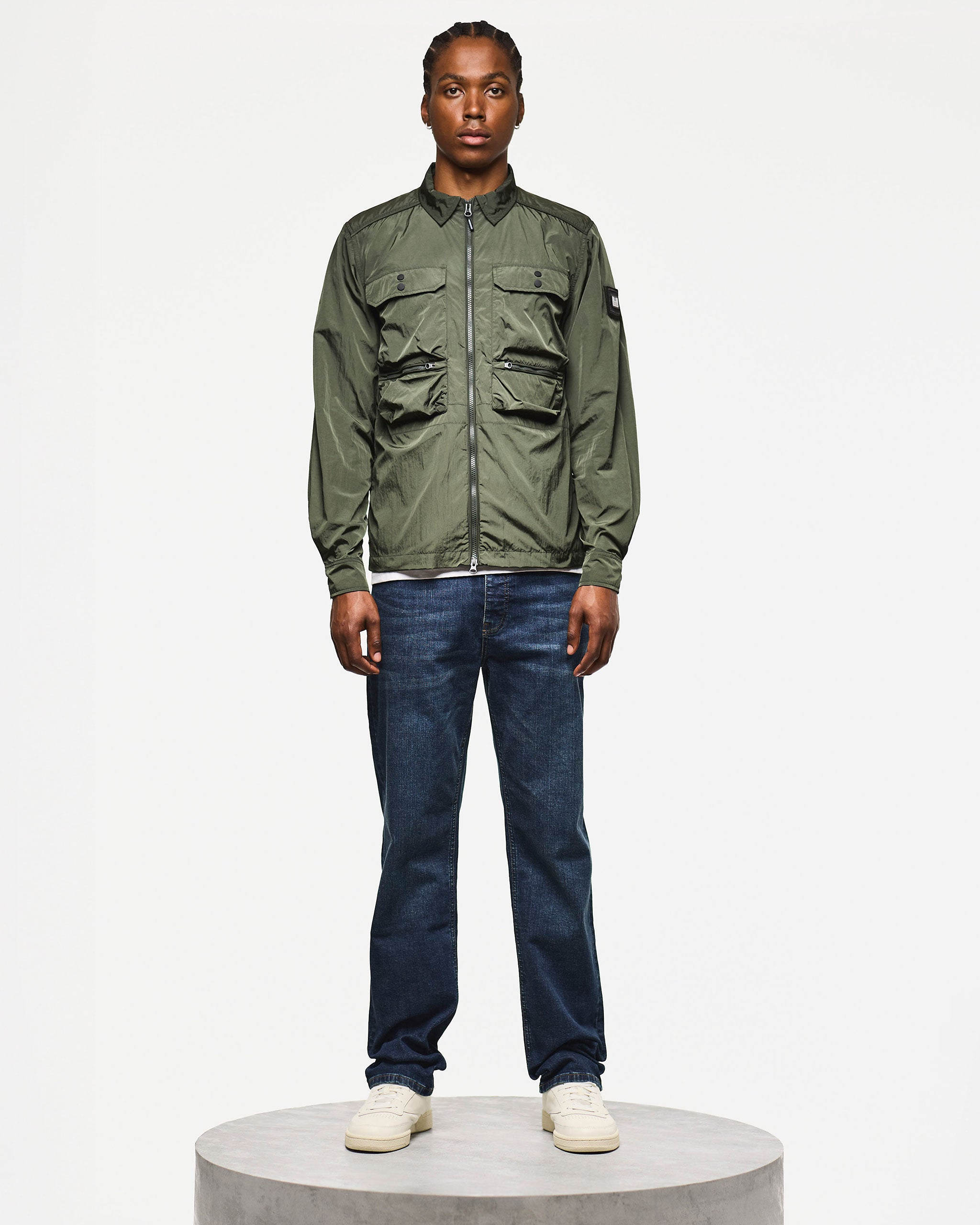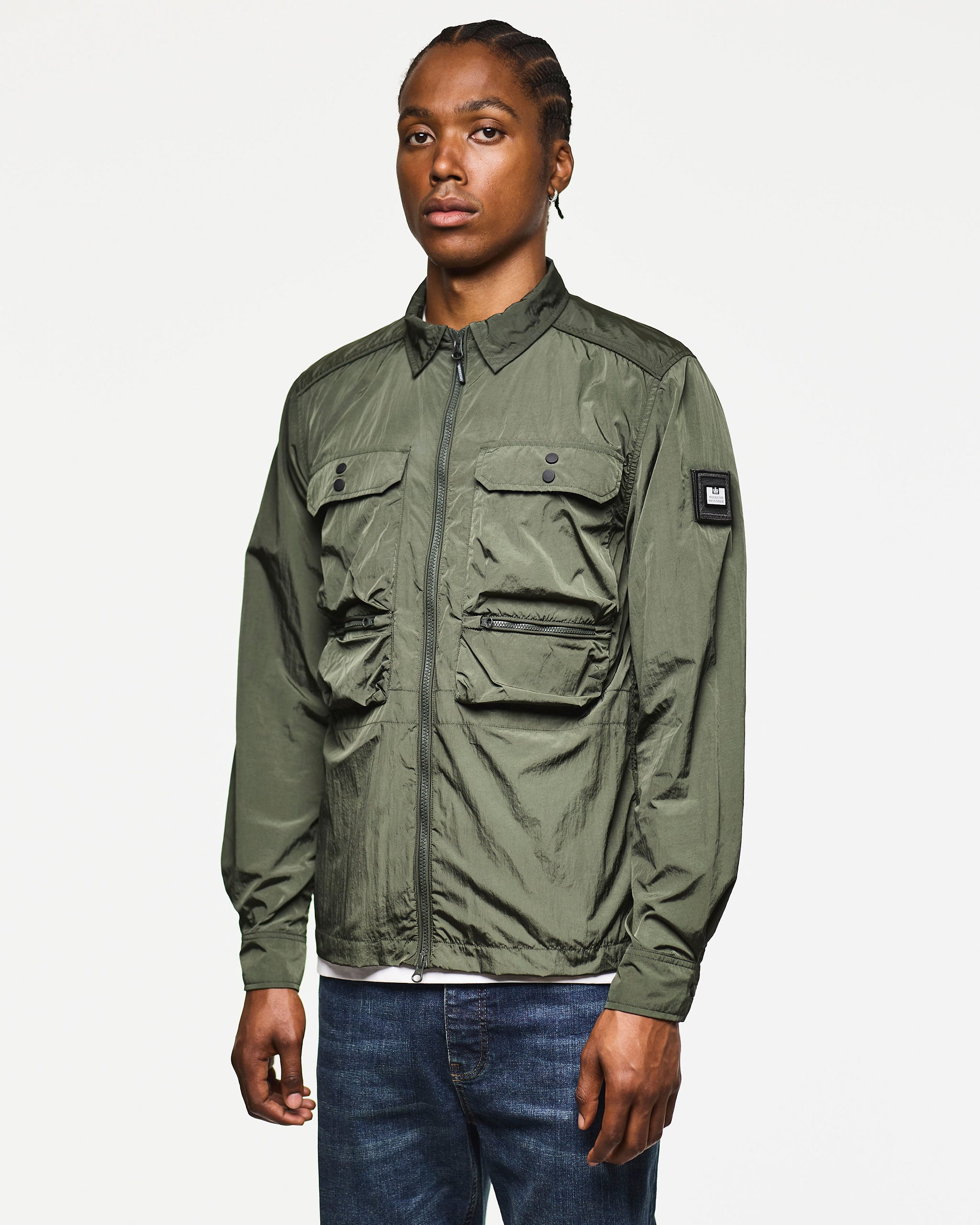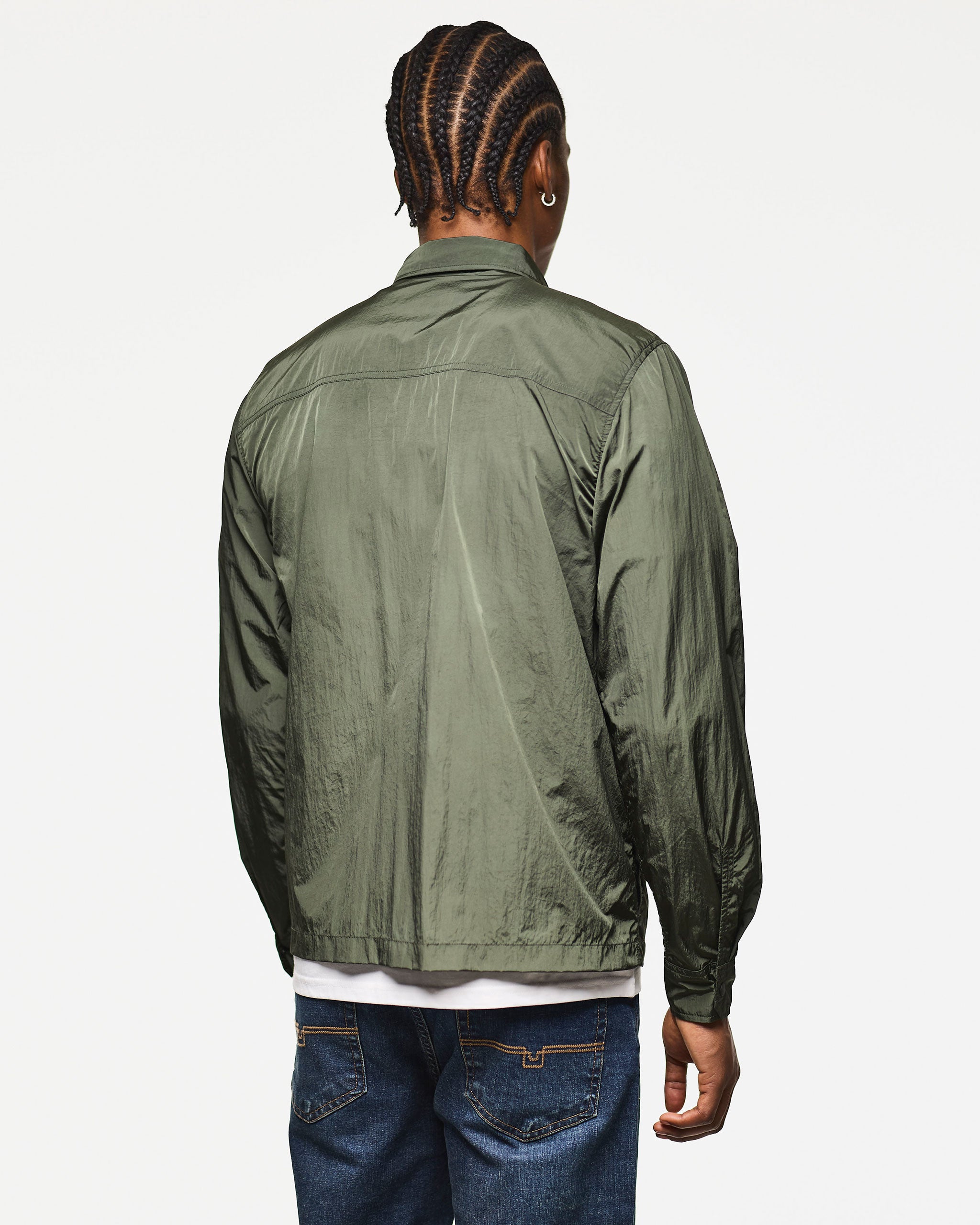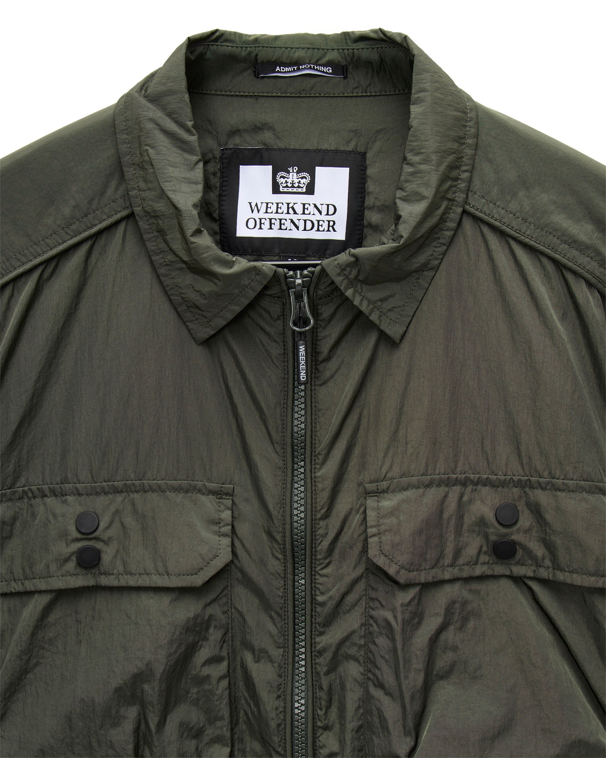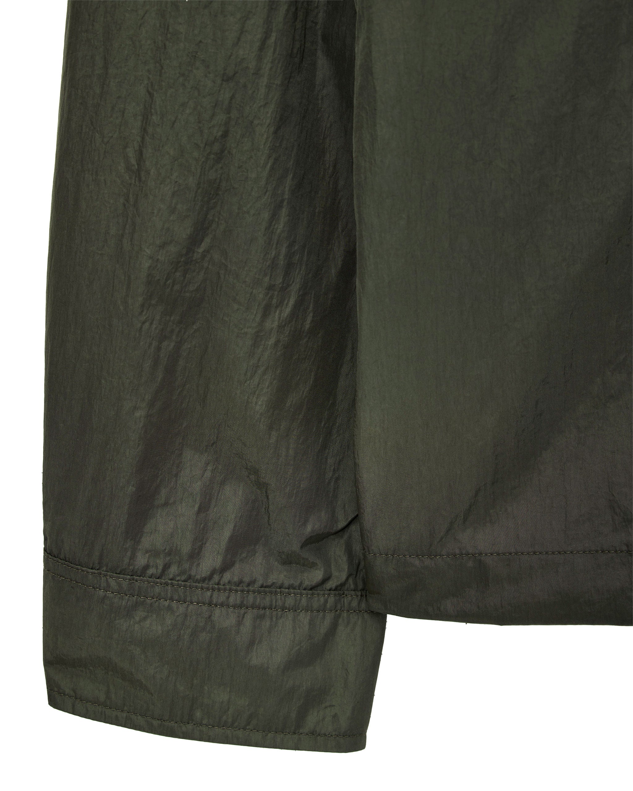 Das Shields Over-Shirt besteht aus leichtem, hochdicht gewebtem 100% Nylon-Fallschirmgewebe mit beschlagener, leicht reflektierender Oberfläche. Mit einer zusätzlichen DWR-Beschichtung (Durable Water Repellent) behandelt.