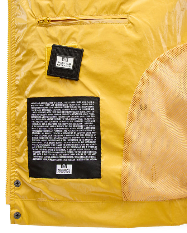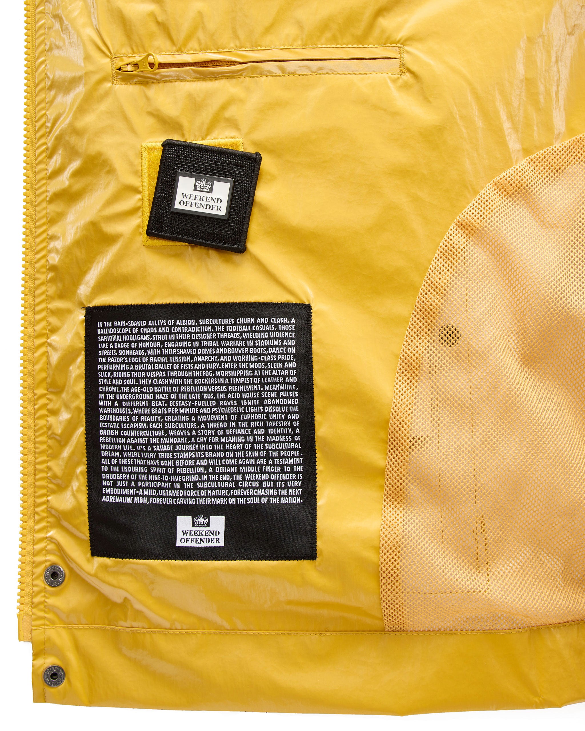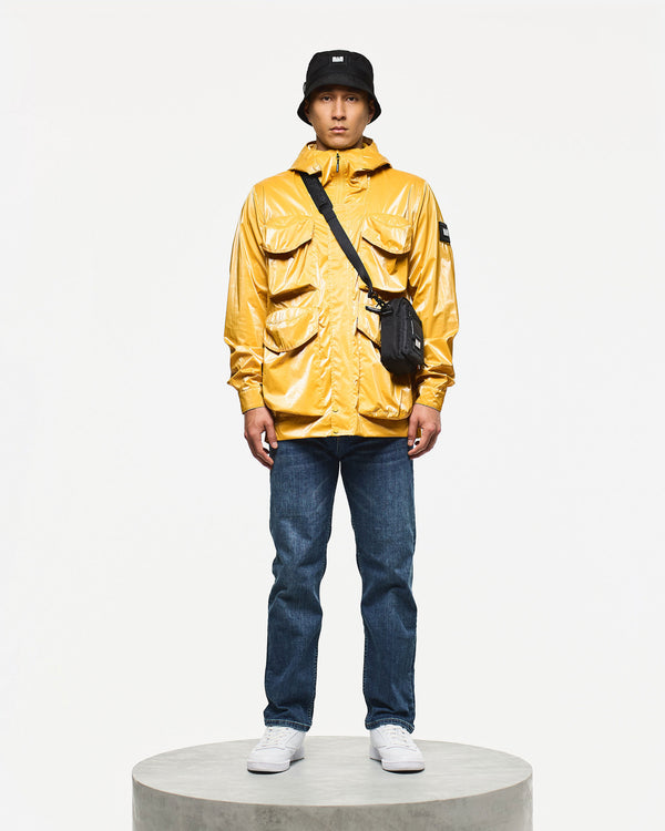 Feldjacke aus speziell entwickeltem, ultrafein gewebtem 100 % Nylon, das mit einer Folienbeschichtung versehen ist, die dem Stoff ein mattiertes, metallisches Aussehen verleiht. Mit zusätzlicher DWR-Beschichtung (Durable Water Repellent).