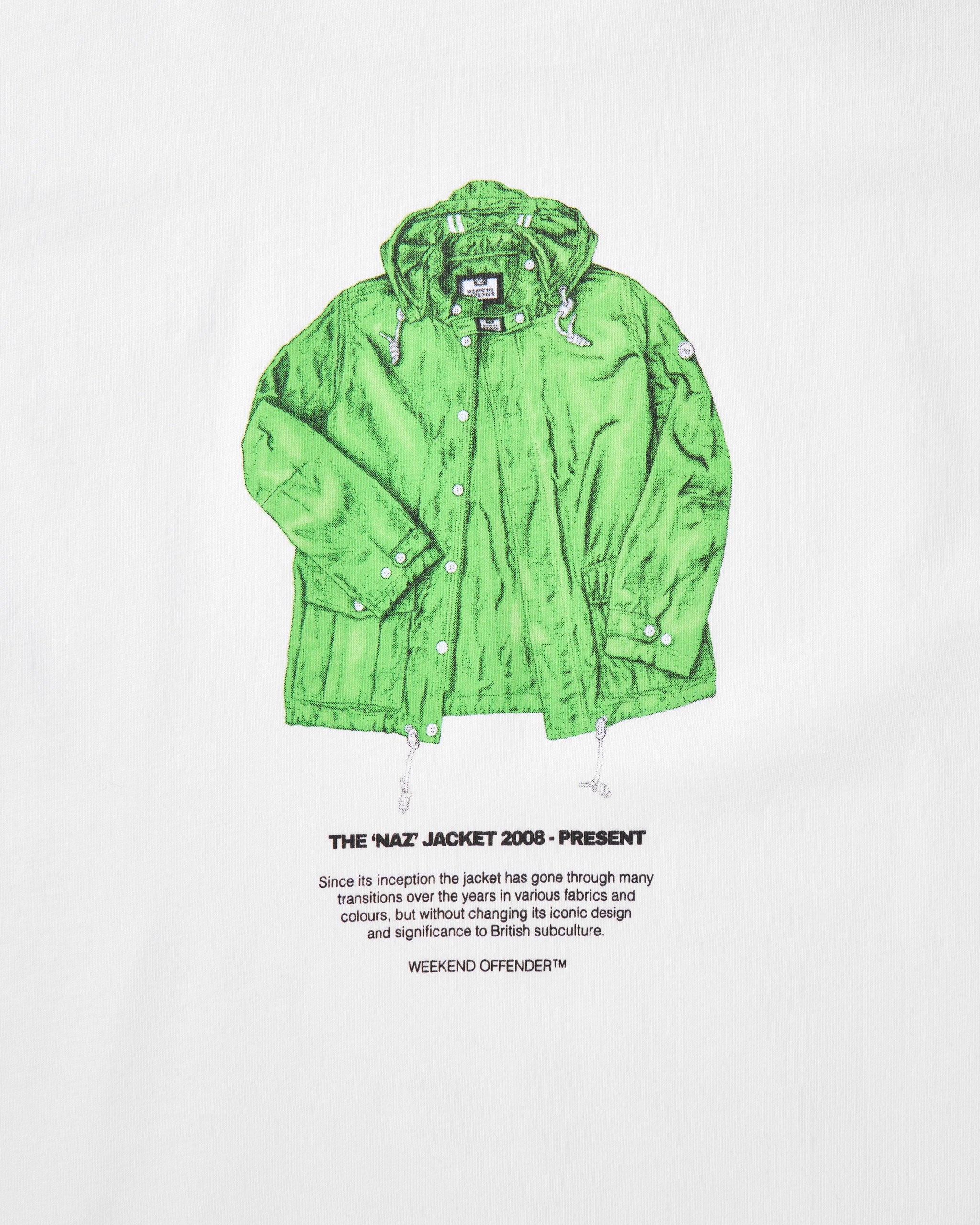 The Kids Naz Graphic Tee features an illustrated tribute to the iconic Weekend Offender Naz jacket — a subcultural staple since 2008, worn by notable figures across music and street culture.