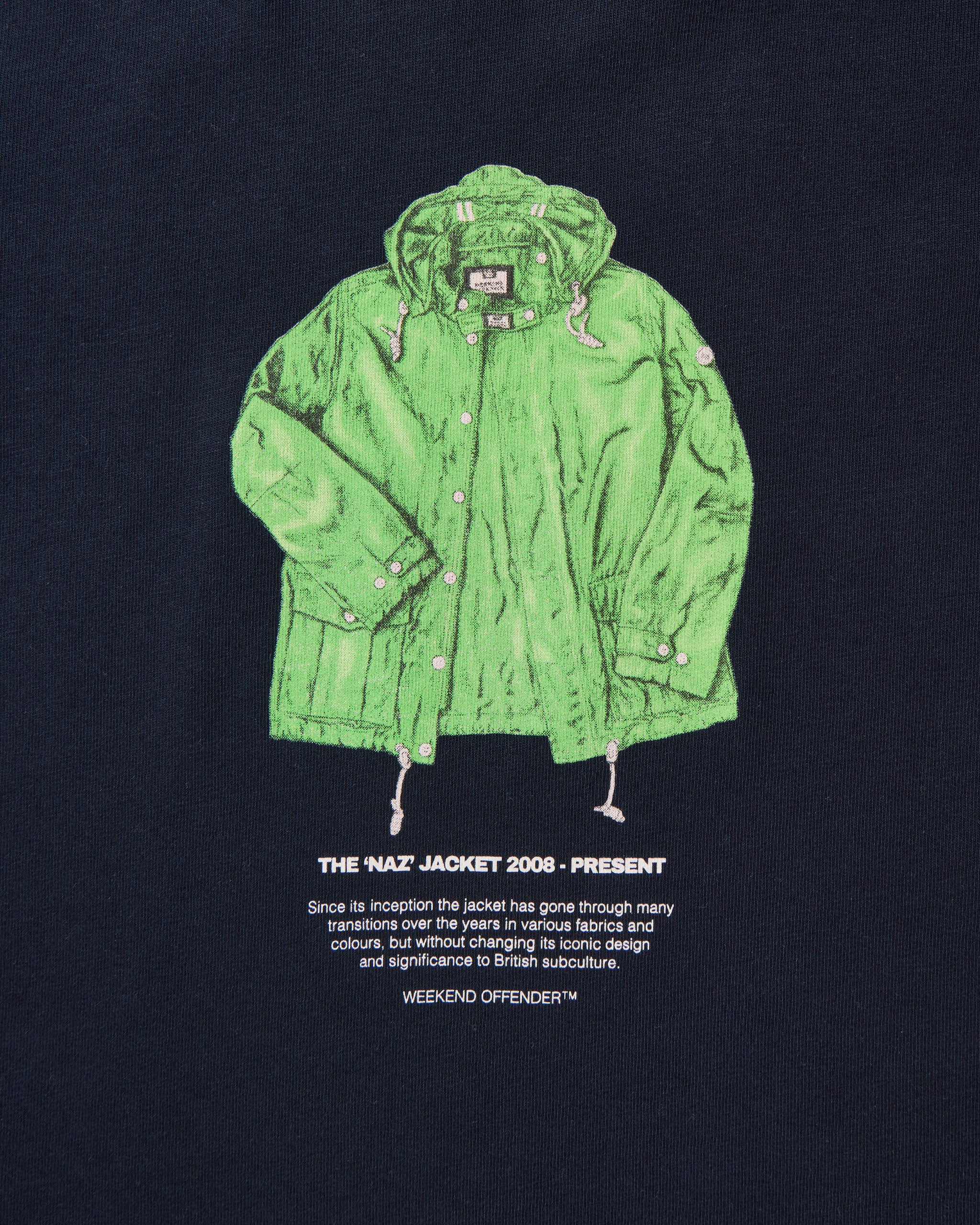 The Kids Naz Graphic Tee features an illustrated tribute to the iconic Weekend Offender Naz jacket — a subcultural staple since 2008, worn by notable figures across music and street culture.