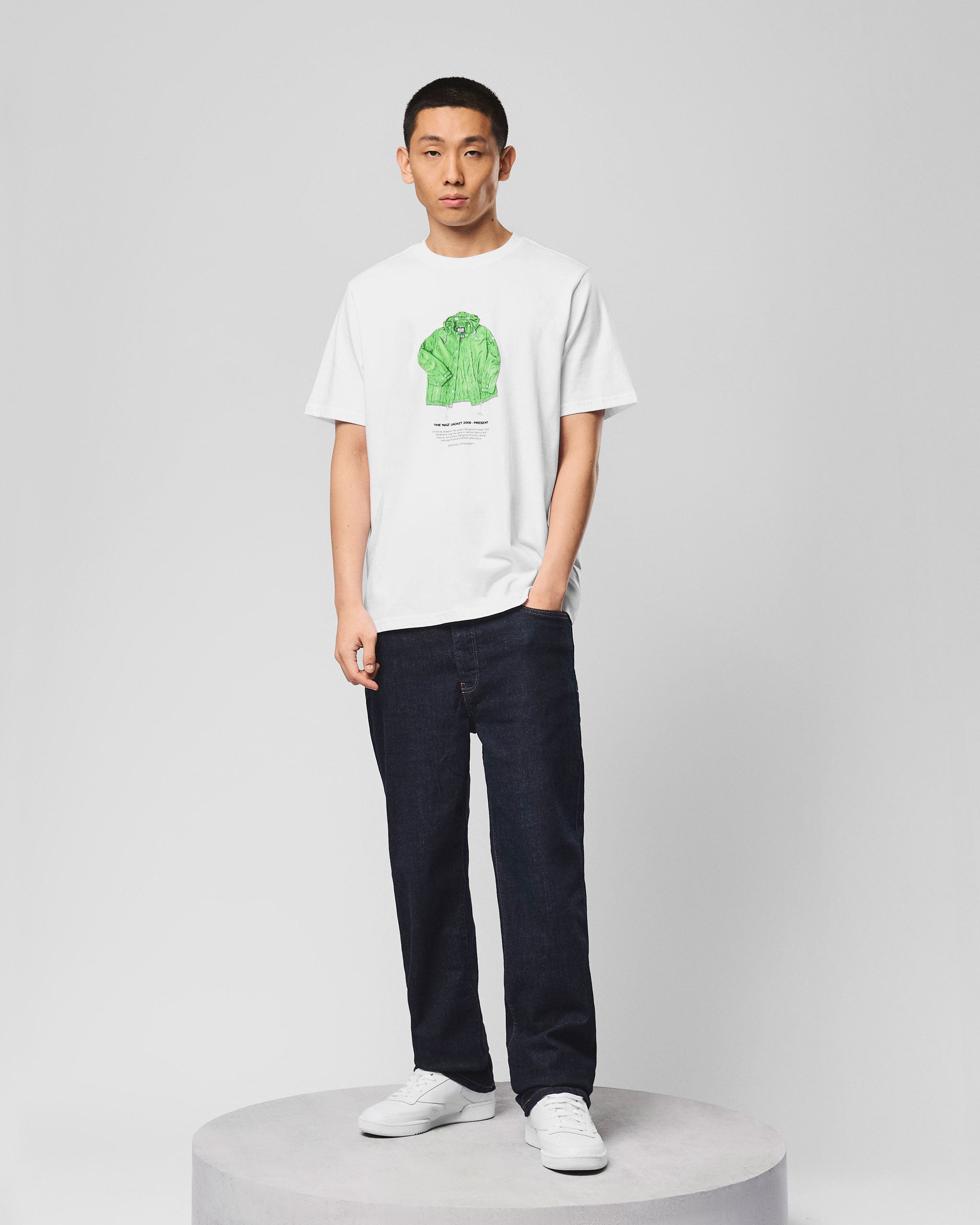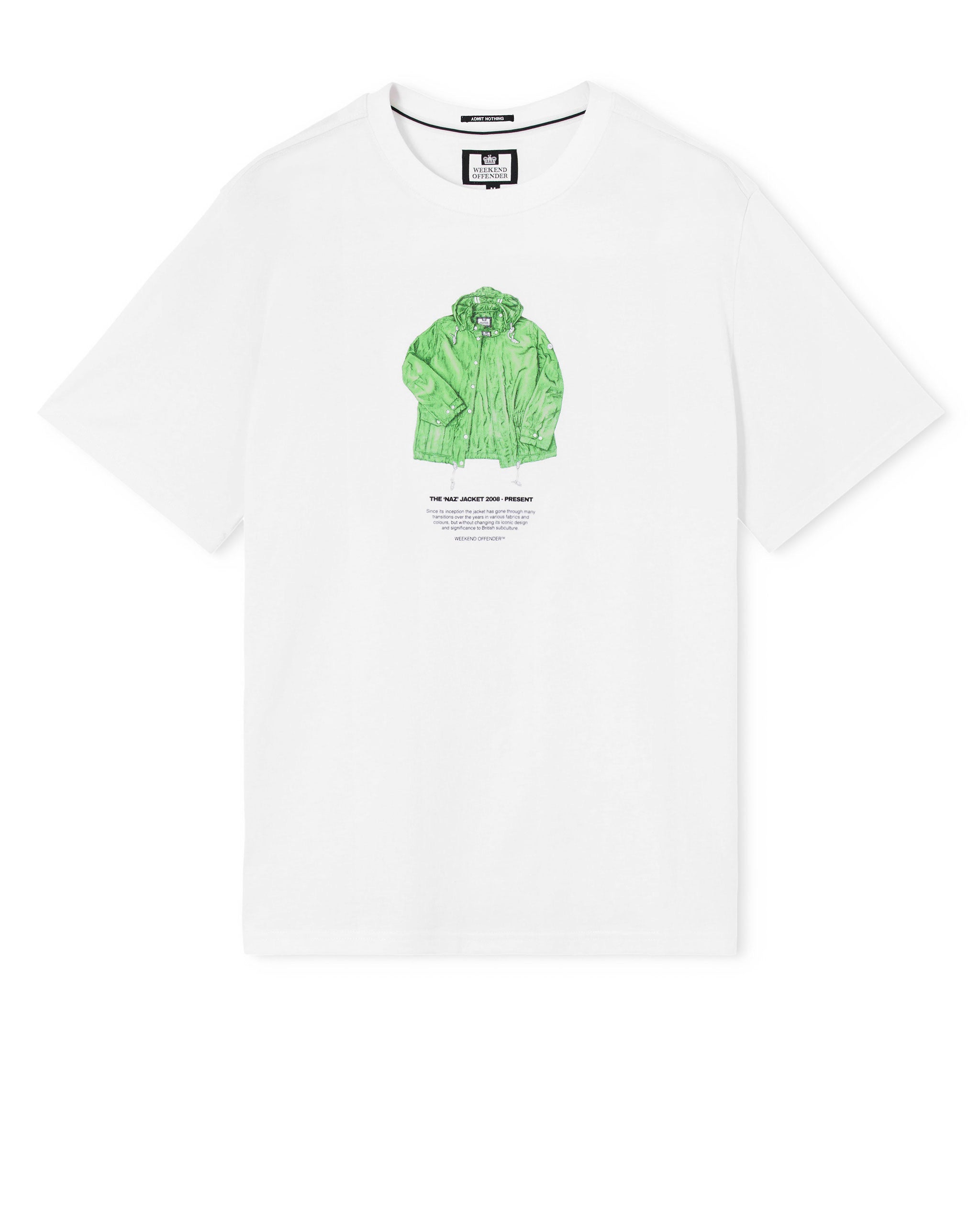 The Nav graphic tee features an illustrated tribute to the iconic Weekend Offender Naz jacket - a subcultural staple since 2008, worn by notable figures across music and street culture.