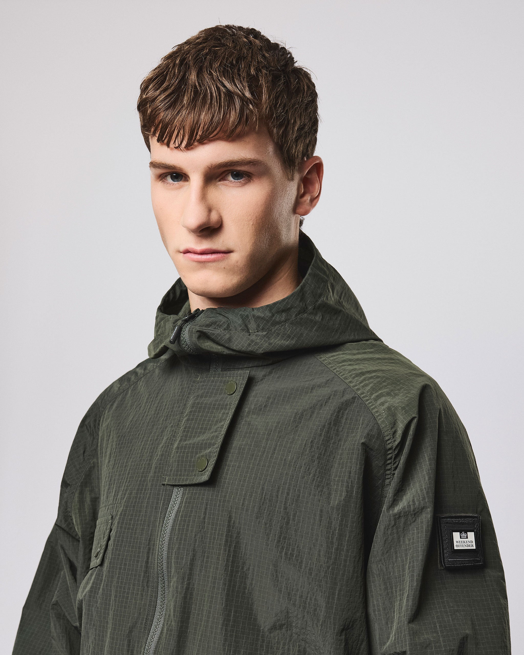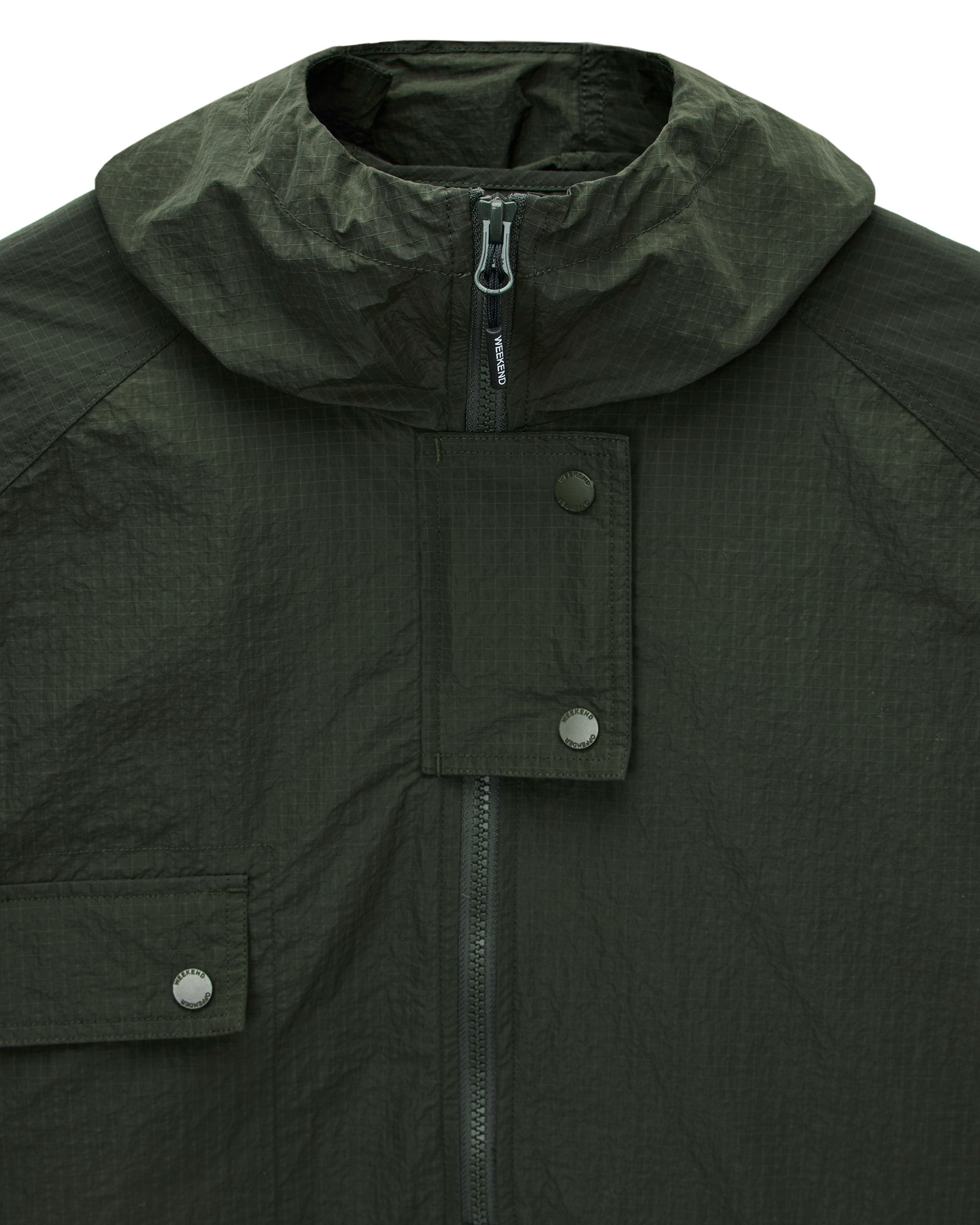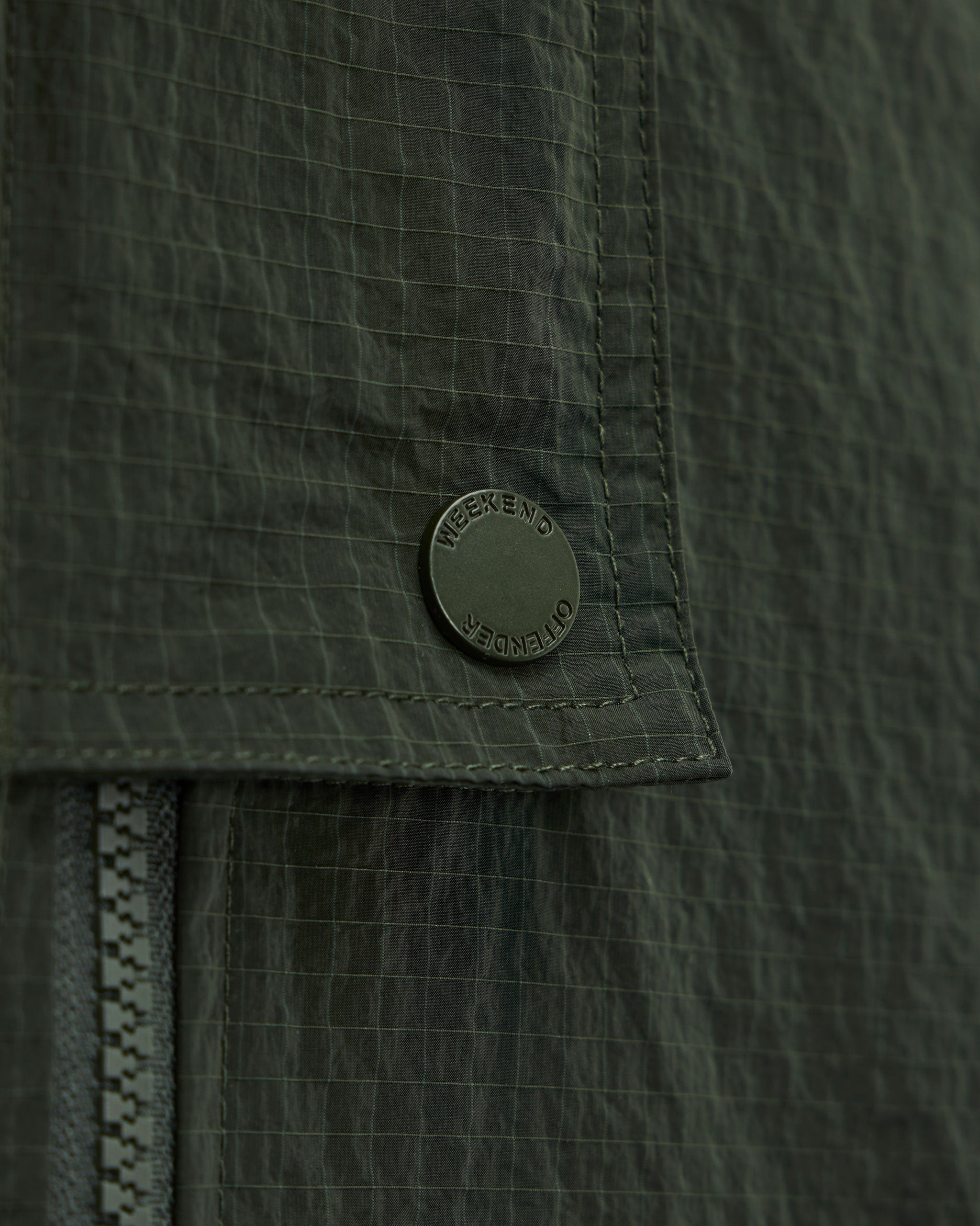 La giacca Zeralda è realizzata in 100% nylon ripstop tonale, tessuto su misura con un filato di trama nero ultra sottile e un filato di ordito saturo per una ricca profondità di colore e resistenza allo strappo.