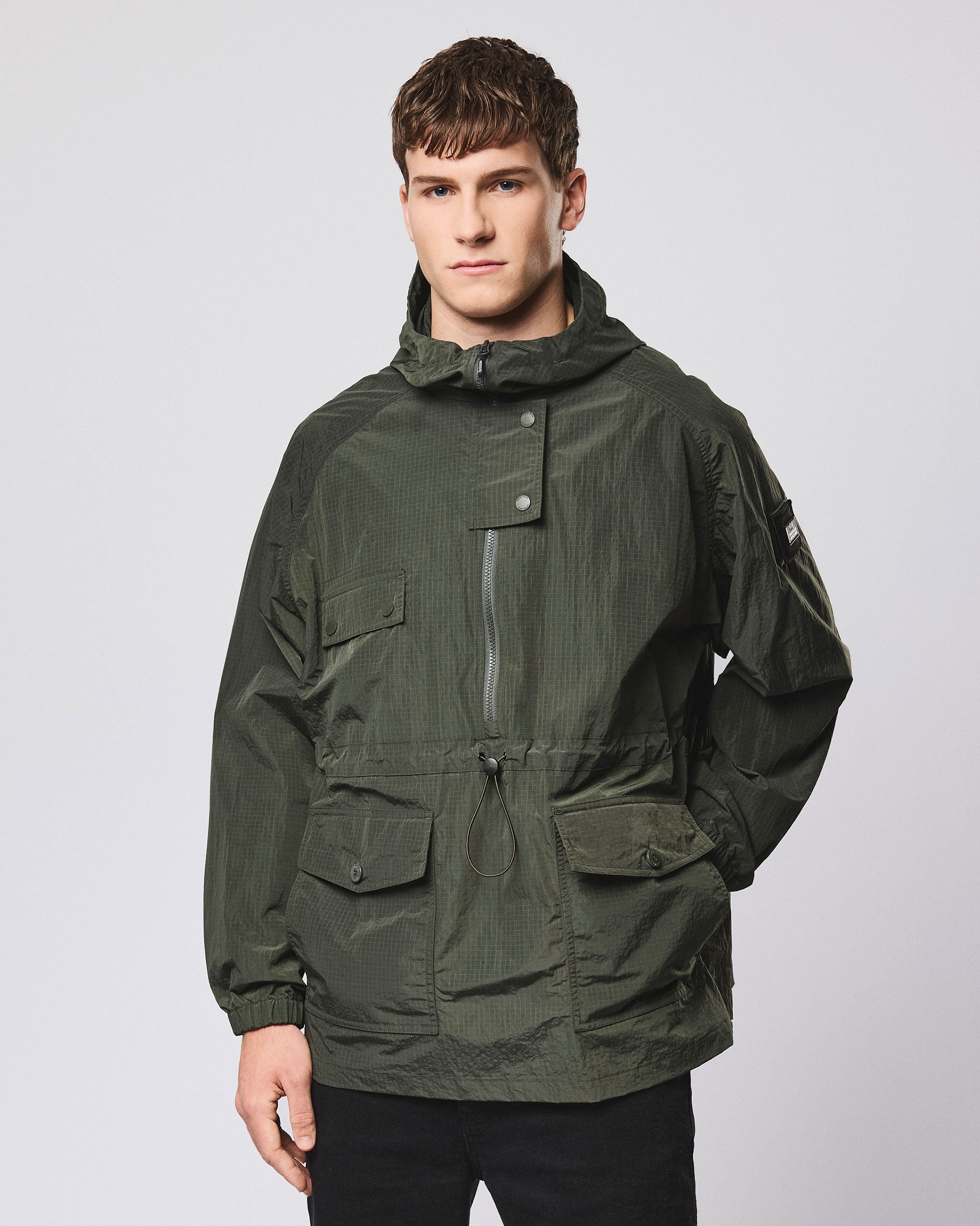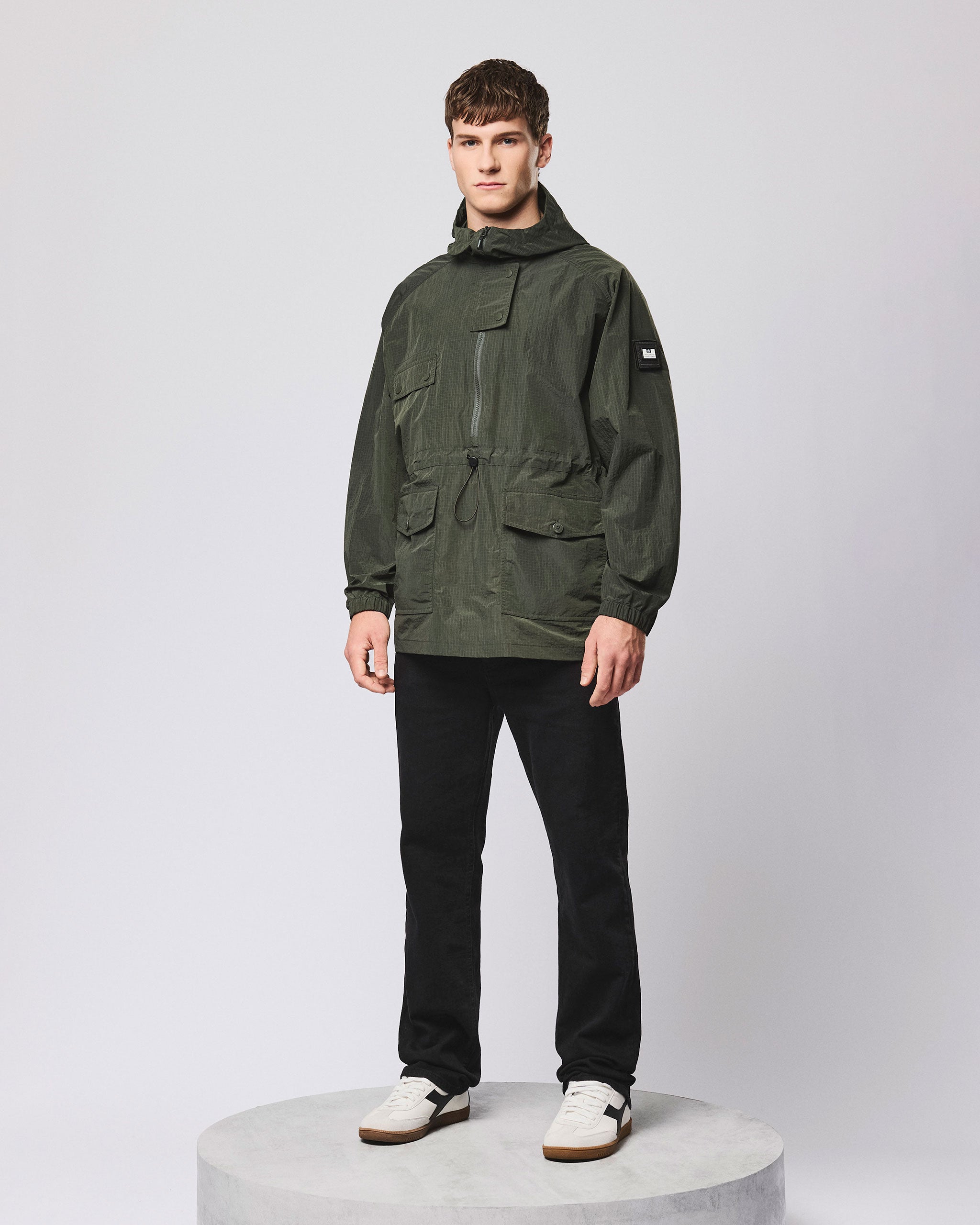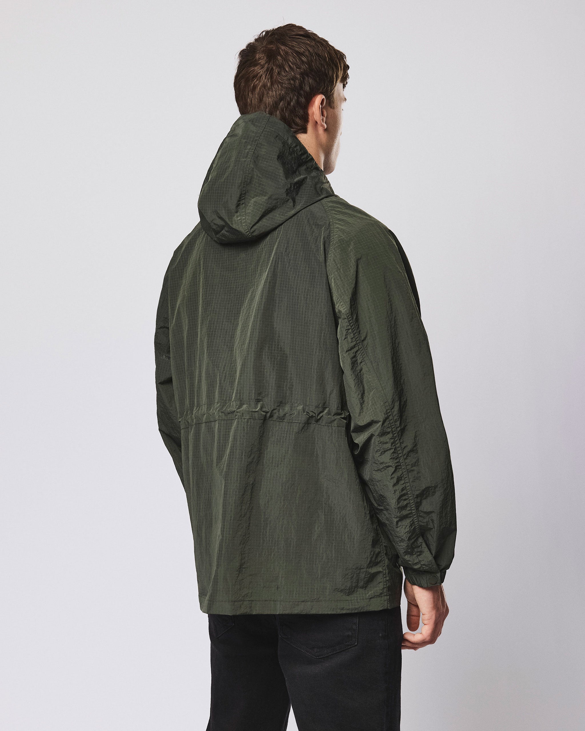 La giacca Zeralda è realizzata in 100% nylon ripstop tonale, tessuto su misura con un filato di trama nero ultra sottile e un filato di ordito saturo per una ricca profondità di colore e resistenza allo strappo.