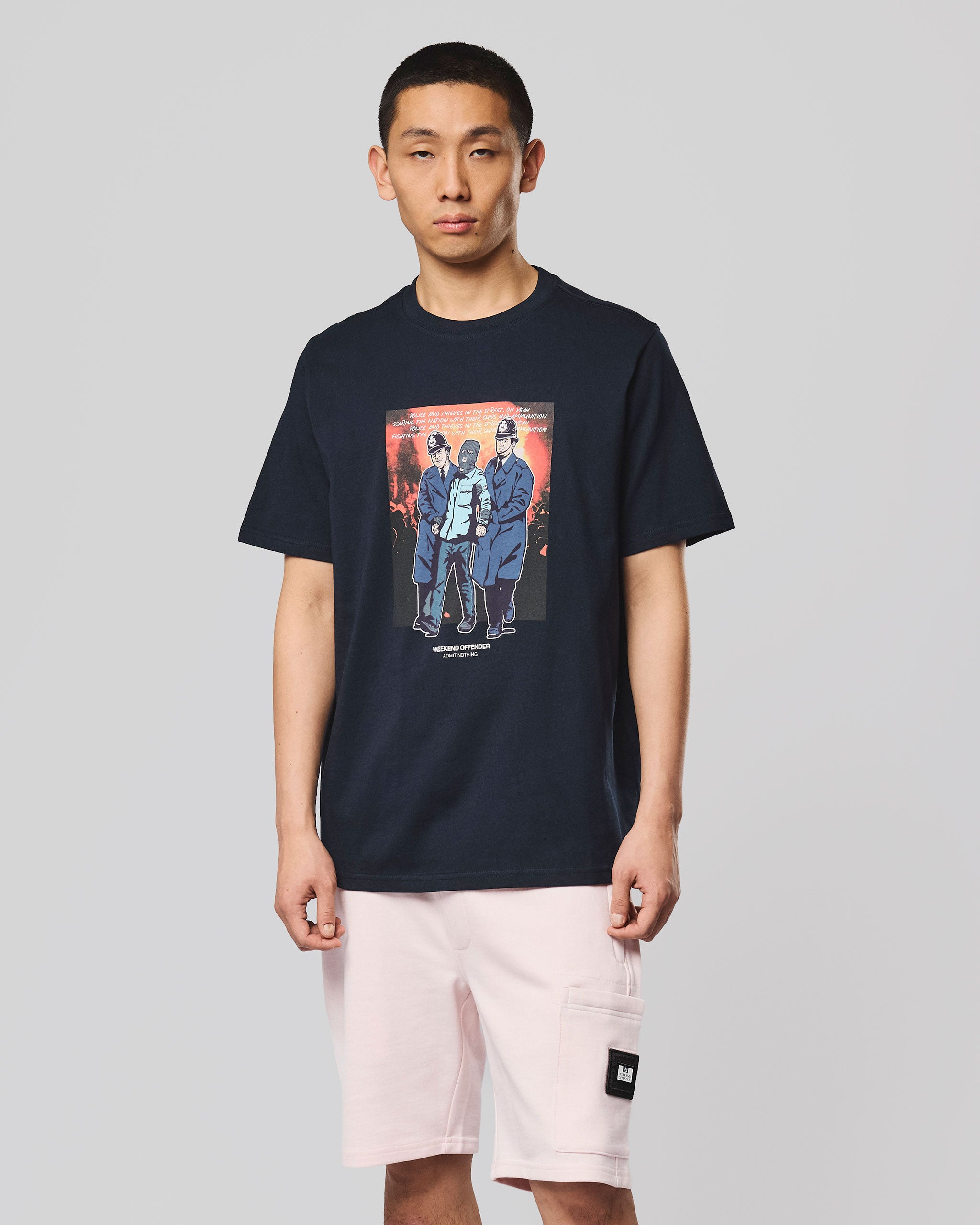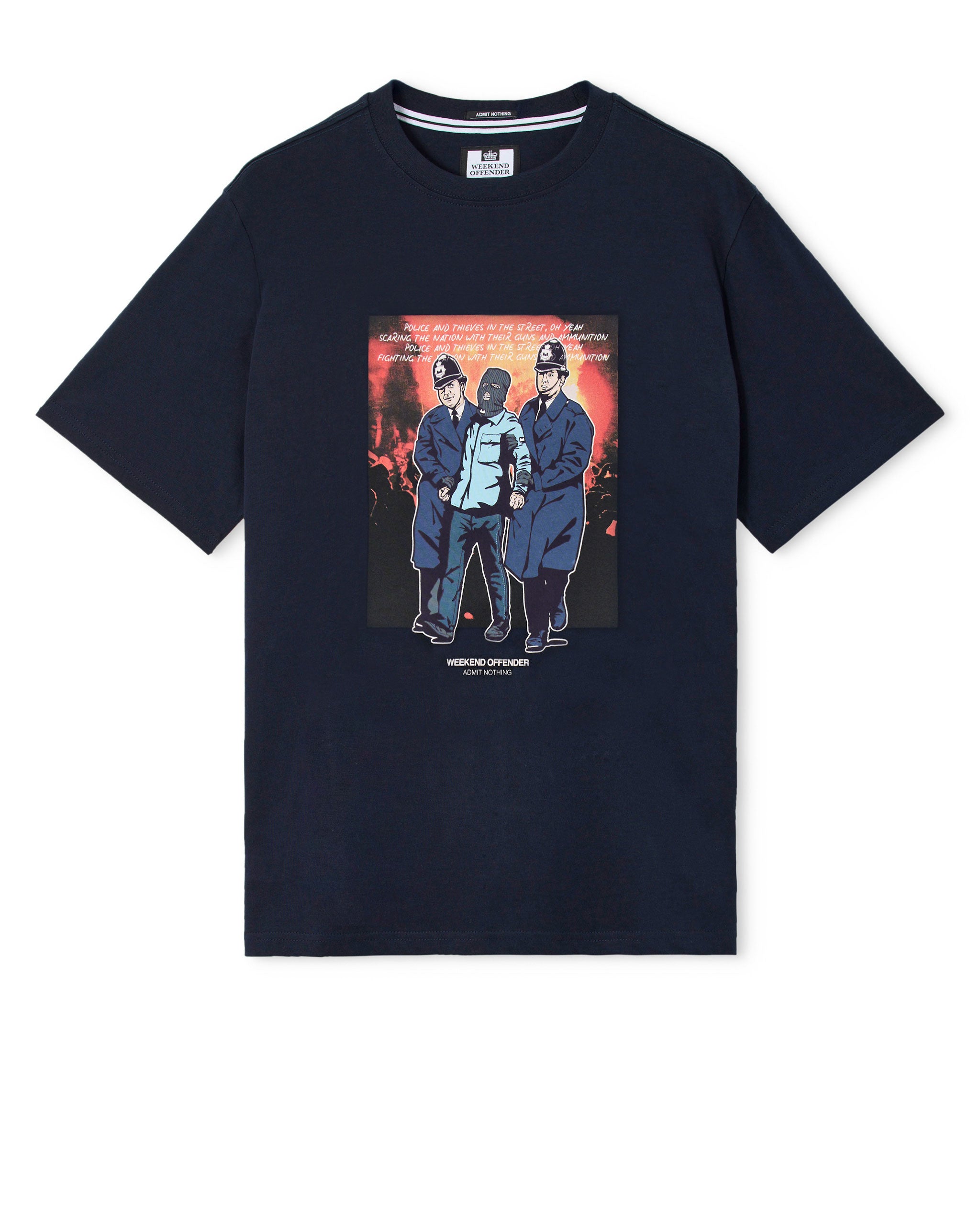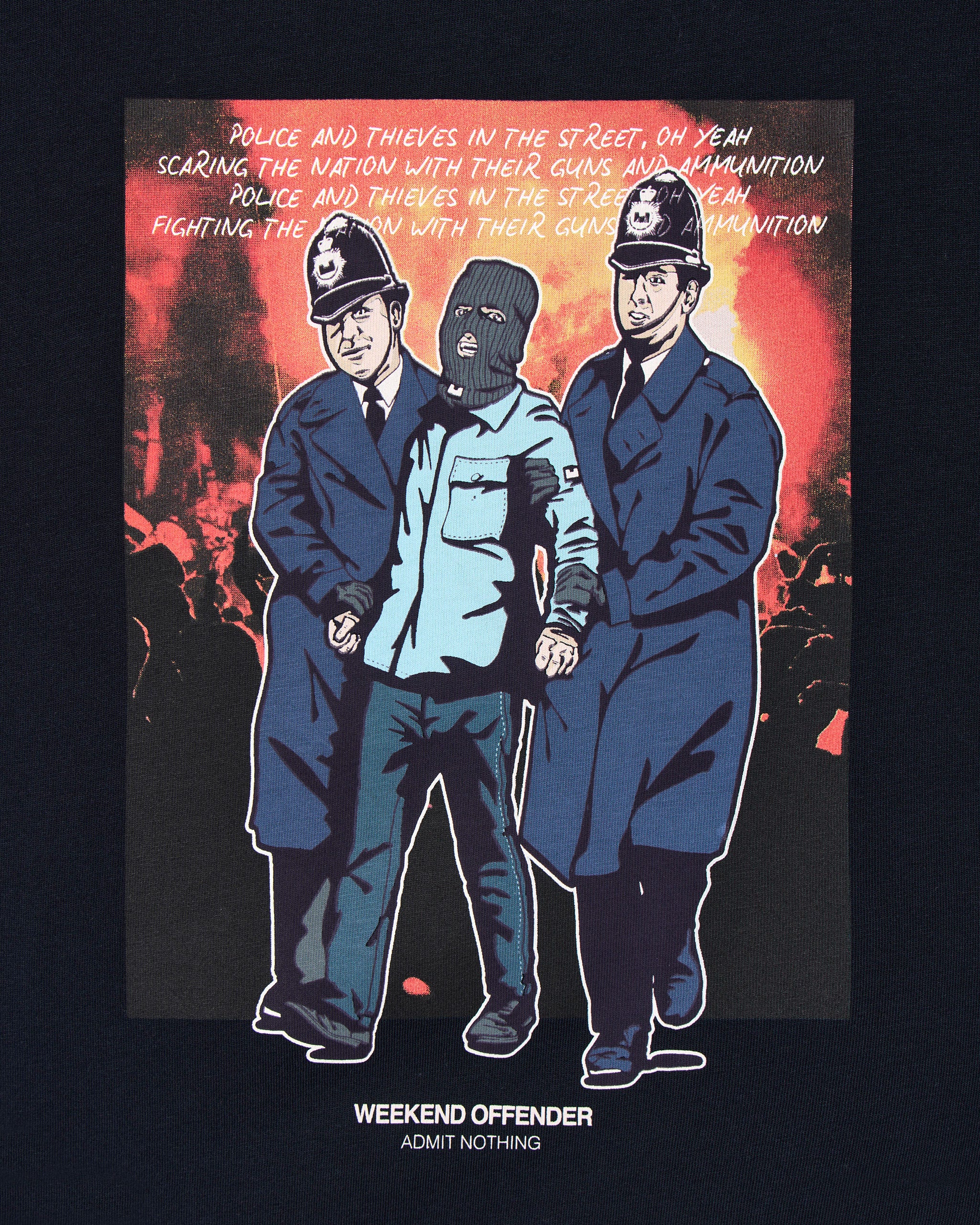 The Murvin graphic tee - Where illustration meets photo realism in this powerful scene of a football fan being led away, set against a backdrop of matchday chaos. Featuring lyrics from “Police and Thieves” by Junior Murvin, this design captures the tension, energy, and defiance that echo through the terraces.